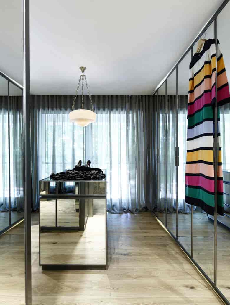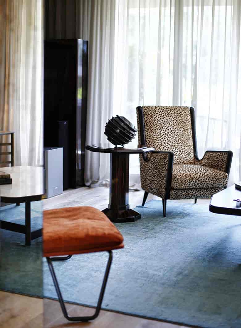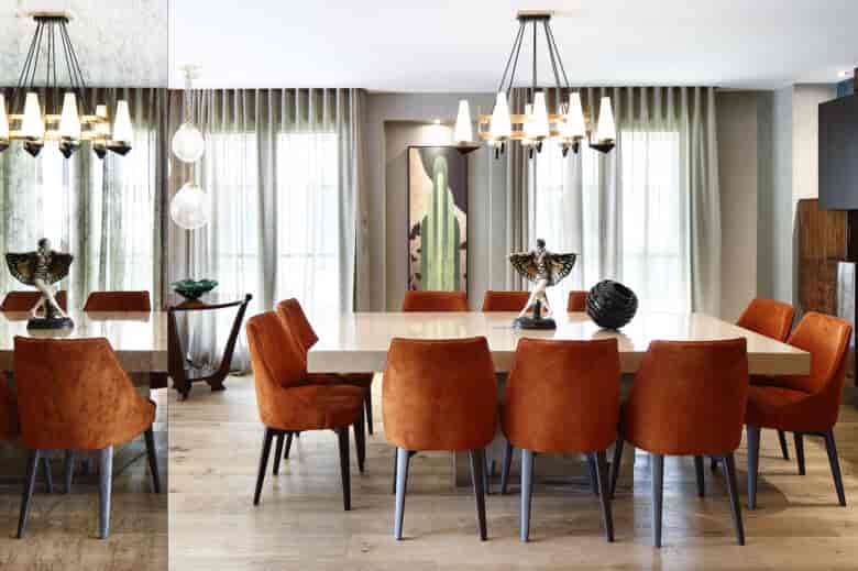 "-- İki kata bölünmüş ve alçak tavanlı bu daireye kişlilik kazandırmak, ışıltı vermek, konukların daha çok gece ağırlanacaklarını da düşünerek bir kimlik yaratmalıydım. Bire bir aktarmak yerine Art Deco'ya öykünen, egzotik sıcak ahşap tonlarını, dore ışıltısını , bej ve zümrüt yeşilinin enerjisini yayan bir atmosfer yaratmak istedim. Bunun için özellikle salonda farklı gösterişli doğal ahşap kaplama oyunlarını bazı noktalarda kullandım. özellikle yemek bölümünün aksında yer alan asimetrik, kübik sergileme alanında... Salonun en sevdiğim bölümü yemek masasının aksında bulunan geometrik sergi duvarı. Arka fonda zümrüt rengi el işi pano ile derinlik kattığımız bu duvarda, hem depolama, hem bar kullanım alanları, hem açık bölümlerinde obje teşhir hedeflendi. Ama her bölümde kullandığımız egzotik farklı ahşap kaplama oyunları ve kutucukların boyut farklılıkları, birbirleriyle ilişkileri, inanılmaz bir düzen ve devinim yarattı... Tüm bu kurgunun yoğunluğu, düz, sade yemek masasını ve iddialı yemek iskemlelerini i bütünledi... Yemek masası aydınlatması dönemin özel tasarımlarından...