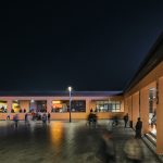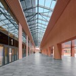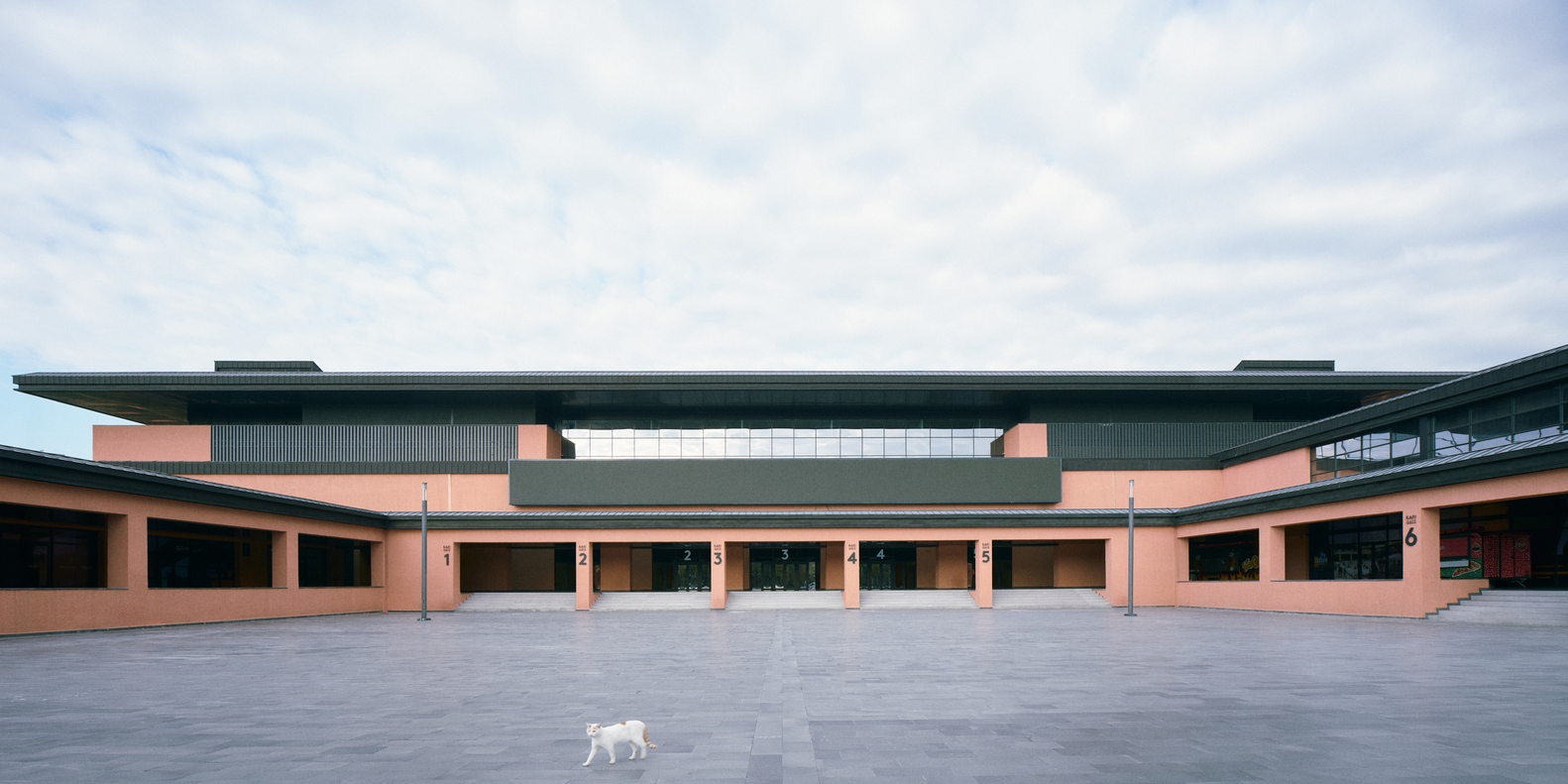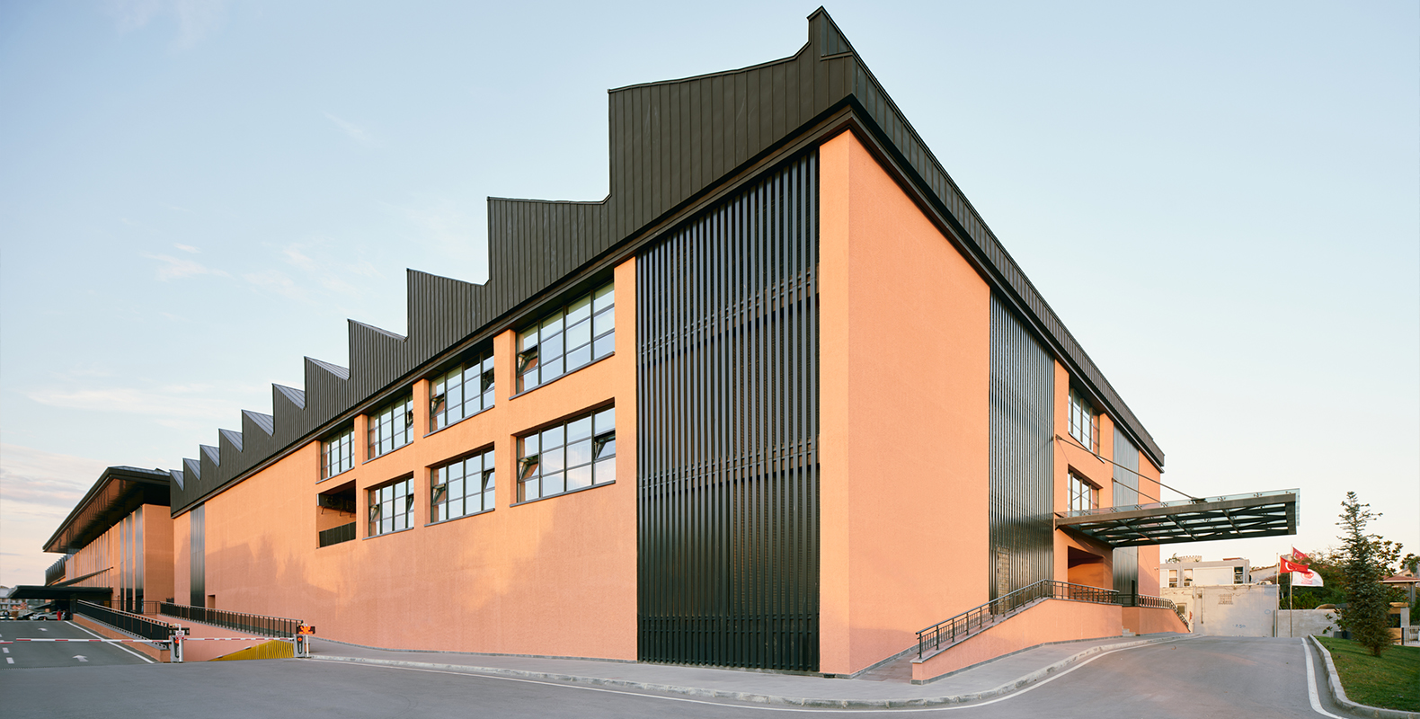 Surların karşısında mütevazı şekilde yükselen çatılar dizisi teknik ekipmanlar için gerekli hacimleri sağlıyor. İç ve dış cepheler dengeli bir ifade kazanırken, korunaklı iç sokak ve ikinci bir zemin katmanı olan portiko üst kotu kademelenen kütleler arasında bir geçiş yaratıyor; hem biçimsel hem de işlevsel olarak. Cephe ve plandaki bu ifade, bugün spor yapısı denince akla ilk gelen; şehirlerin periferisinde, çevresi ile ilişkilenmesi zayıf, içe dönük, bulunduğu yere kendi kurallarını dikte eden mega-ikonik yapılarda görülen kurgunun aksine bağlam ve program etrafında gelişen anonim bir mimari yaklaşımın sonucu.