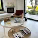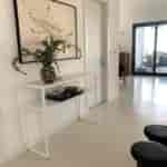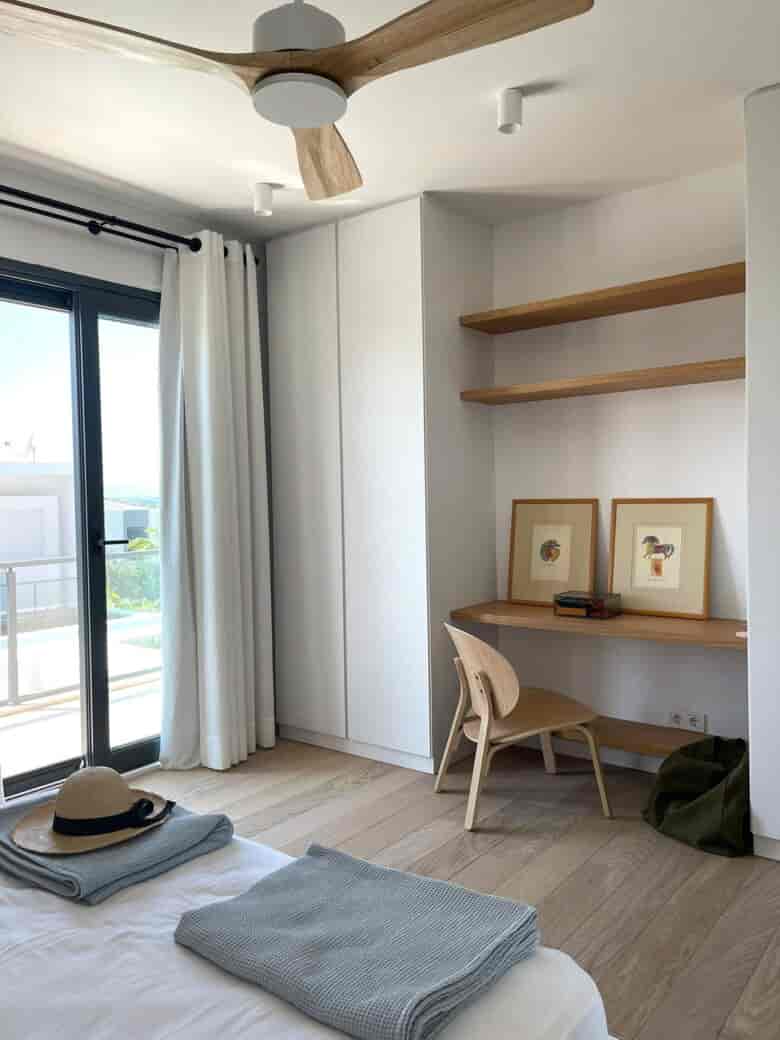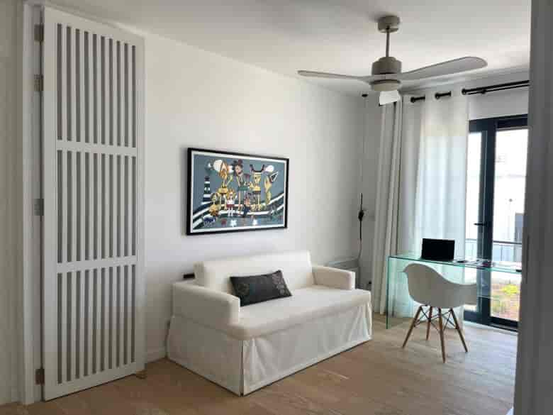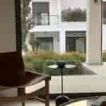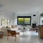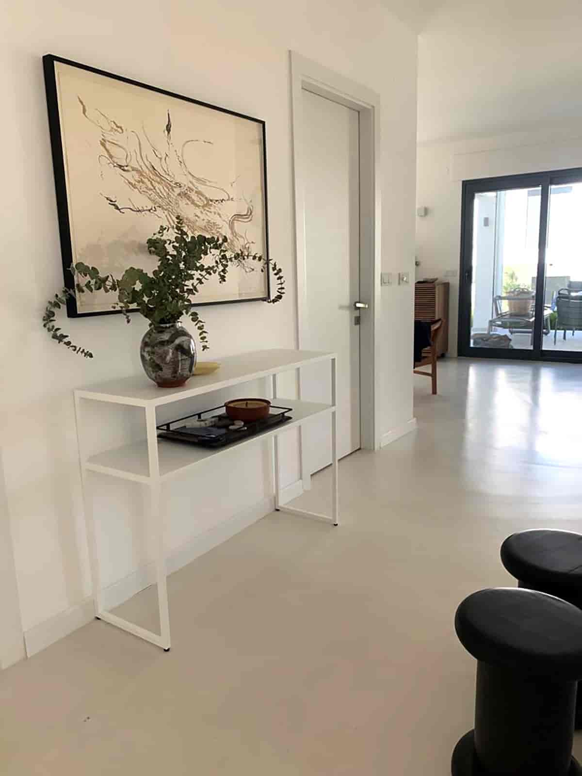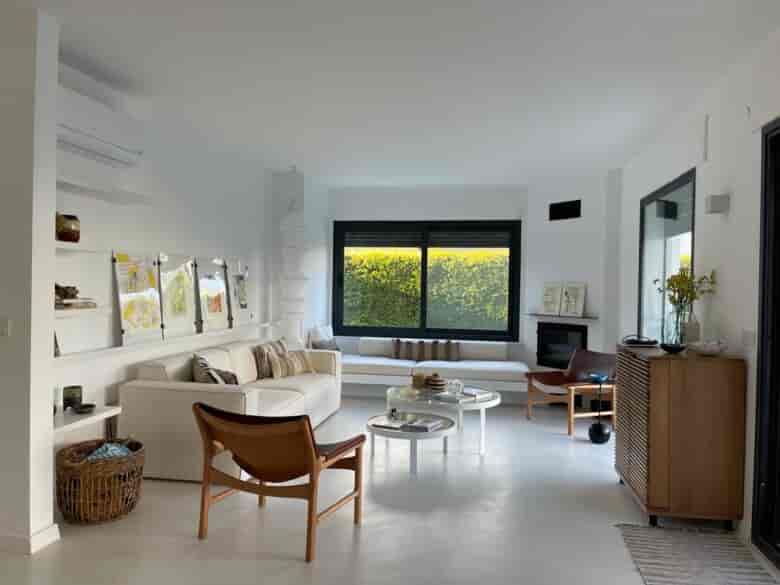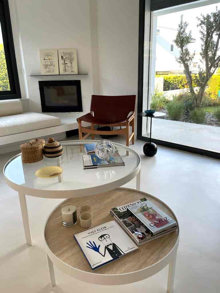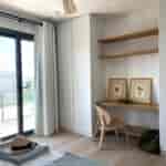 Dış mekandan içeri doğru uzanan homojen renk ve doku paleti doğanın ve sanat eserlerinin rengini ön plana çıkarırken dinginlik ve sadelik iç mekanda da ana tema olarak devam eder. (Mimar olarak zaten fazlasıyla renk, malzeme ve mobilyaya doymuş olduğumdan bu mekanda ruhum hep bir dinginlik ve boşluk hissini arıyor, evin dışı gibi içini de sadeleştirmek doğa ile olan sınırları geçişken hale getirmek istiyordum.)