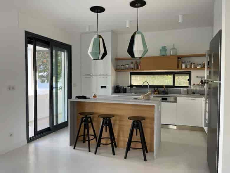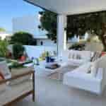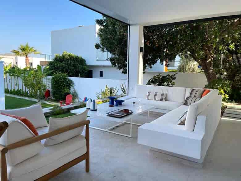 Aynı fikir ile konstrüksiyon sedirler, ara bölmeler gibi çoğu mobilya da mimarinin bir parçası olarak çözümlenmiş mümkün olduğunca az hareketli mobilya ve az çeşitte malzeme kullanılarak bayağı bir tasarruf sağlanmıştır. (Pergoladaki sedir, içerdeki oturma alanı olarak uzayan şömine seti, duvardan çıkan raflar…) Aydınlatmaya özel bir önem verilmiş olup tavan yüksekliğini düşürmemek için hiçbir yerde asma tavan yapılmamış ve seçilen aydınlatma elemanları günün saatine göre farklı ambiyanslar yaratacak şekilde belirlenmiştir.