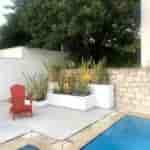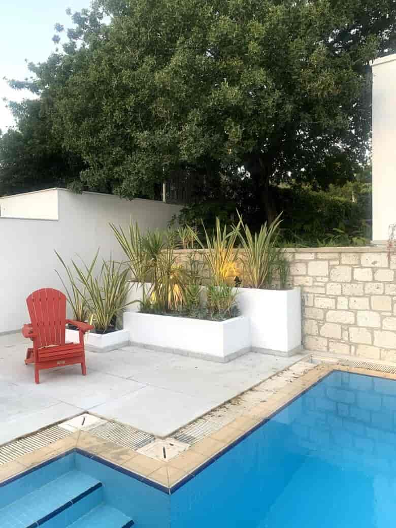Ayrıca iki evin ortasında bulunan havuz son derece nahoş bir istinat duvarı ile tüm arsayı bölerken görüntüyü hafifletecek kademeli çiçeklikler, doğal taşlı bir doku ve aydınlatmanın yardımıyla iki bina arasındaki keskin sınır parçalanıp diyalog güçlendirilmiştir.