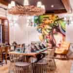 The choice of colors has followed a careful market analysis aimed to internationalization of the project, in line with international trends. Colours like green tiles and dark grey and parquet mixed floor generate the right contrast. This contrast is marked by the presence of wooden frames separating the two types of materials. Stools and tables have a retro design and are made entirely of metal coated on top of wood. The counter has wood paneling which supports a plan that follows the side of the unit. Additional details include a graffiti-style mural covering one wall, and specked white lampshades adorning the pendant lamps and sconces. In addition, all the furnishings were designed by GVDS.