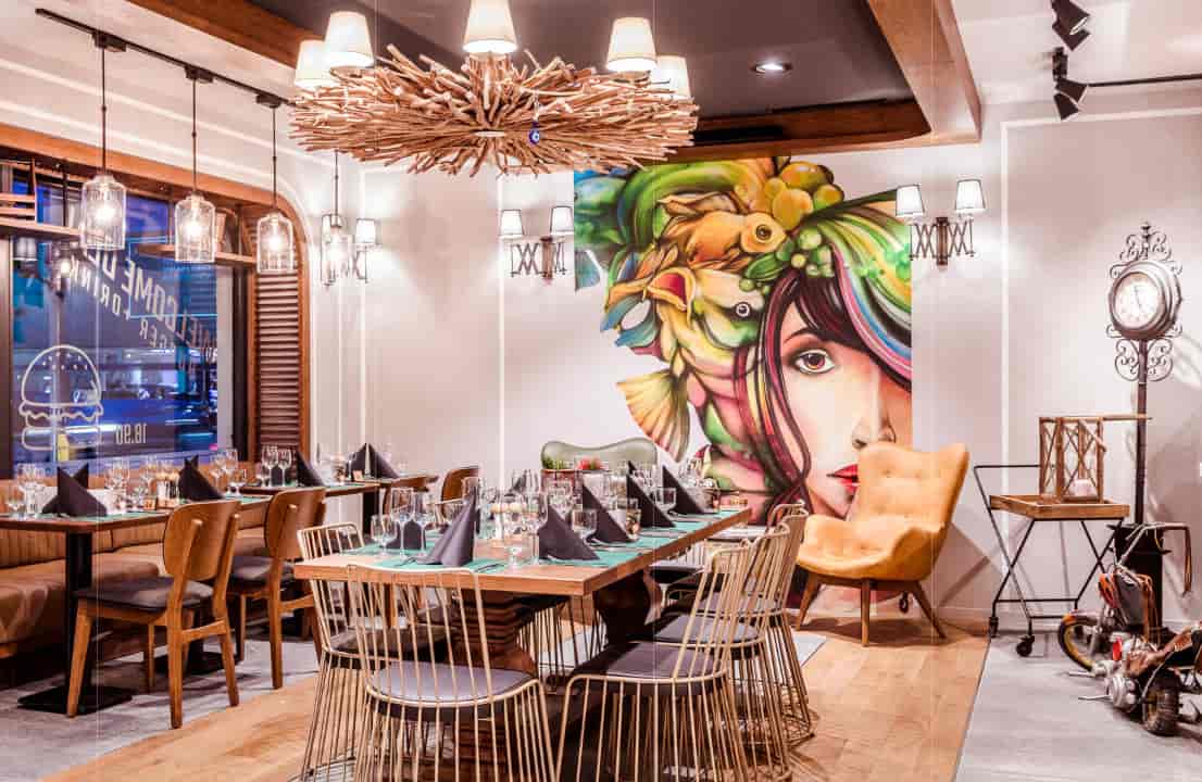 A key element of differentiation in this most recent venue of the brand was the decision to push inwards the boundary of the interior space. Furthermore, the Endi Burger House Concept is enriched with the addition of certain new cladding materials, as well as decorative elements that combine graphics with lighting and incandescent lamps, giving them a three-dimensional and vibrant effect. Custom designed furniture, such as brownish booths reminiscent of the old times train locomotive seating furniture, create interesting relaxing corners for small or larger parties. The restaurant gets a more youthful and contemporary vibe while maintaining the warm and friendly atmosphere that characterizes the new identity of Endi Burger House.