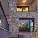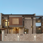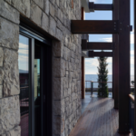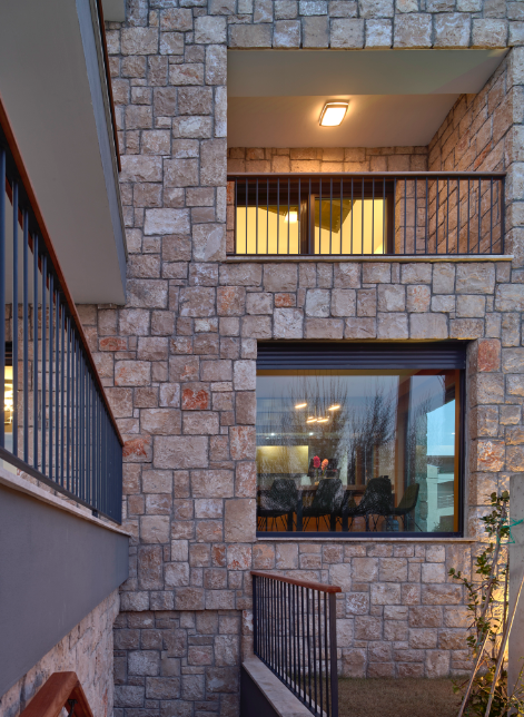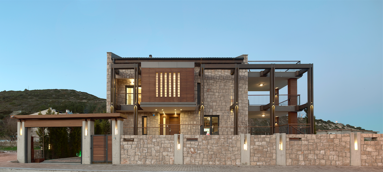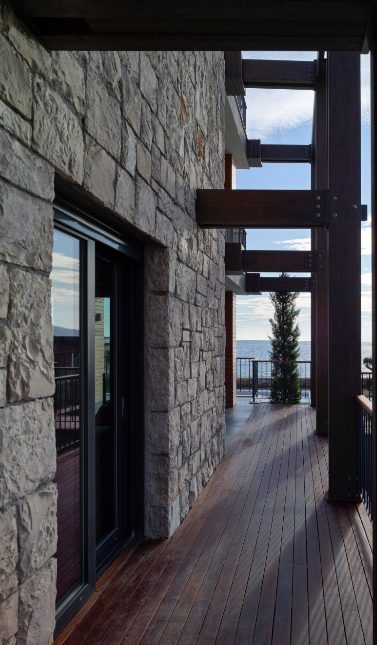 Beden duvarlarının geçirgenliği yönlenimine paralel olarak denize doğru arttırılmıştır. Cephesi doğal taş tarafından tamamen sarılan projede hem bağlamsal hem fonksiyonel olarak işlevlendirilen masif ahşap strüktürler iki beden duvarı arasındaki kütleye entegre olmuştur. Dağlar ve deniz arasındaki bağlantıyı sağlamak amacıyla bağlamsal olarak işlevlendirilen masif ahşap strüktür, aynı zamanda kullanıcıların yapı girişinde havuz ve deniz vistasına yönlendirilmesini sağlayacak bir unsur olarak işlevlendirilmiştir. Masif ahşap strüktür çatıyı da sararak hem yapının üst katında bulunan mekanlarda kat yüksekliğinde artış sağlanmasına olanak vermiş hem de ara kullanım alanları oluşturmuştur.