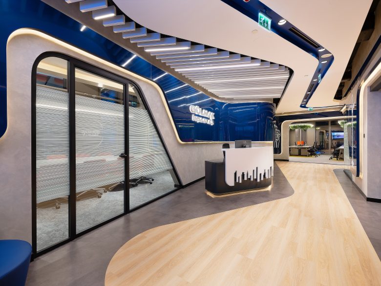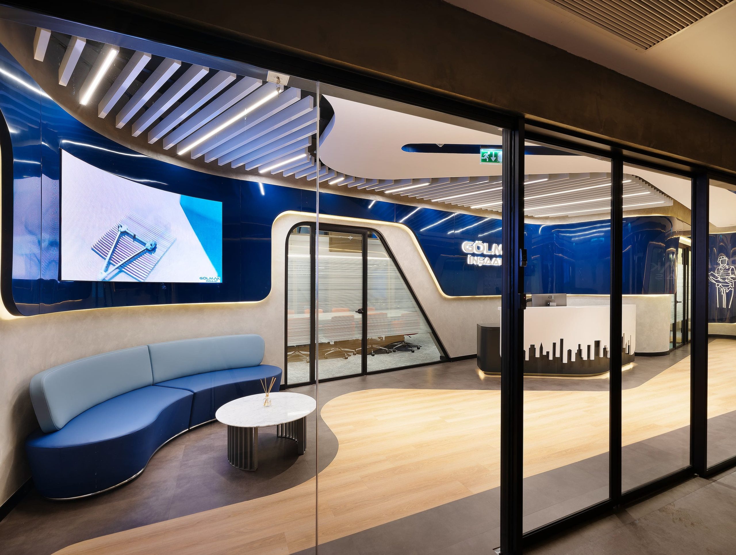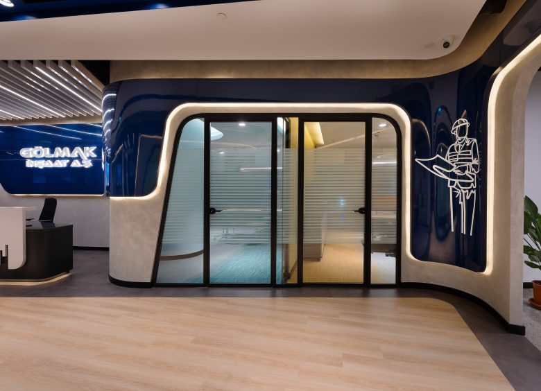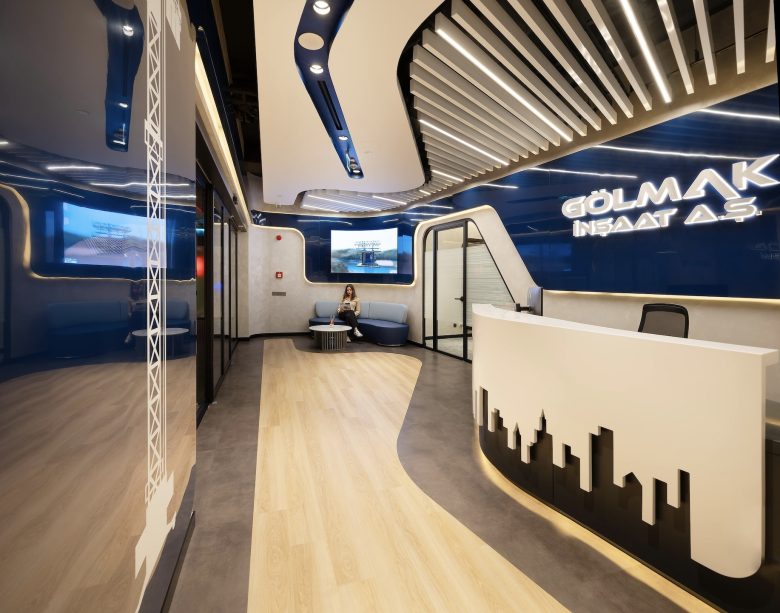Gölmak İnşaat için tasarlanan ofis iç mekân projesi, İstanbul Maltepe’de 450 m²’lik bir alanda yer almaktadır. Tasarımın temel kriteri, firmanın faaliyet gösterdiği sektör ile mekânsal bir ilişki kurmaktır. Bu doğrultuda, inşaat sektörüne ait bazı belirleyici ve karakteristik unsurlar proje tasarımına entegre edilmiştir. Resepsiyon bankosundan başlayarak tüm ofisi dolaşan akışkan mavi duvar yüzeyindeki grafiklerle bu anlayış güçlendirilmiştir. Bu sayede tasarım ile firmanın faaliyet alanı ilişkilendirilerek mekâna bir aidiyet duygusu kazandırılmıştır.