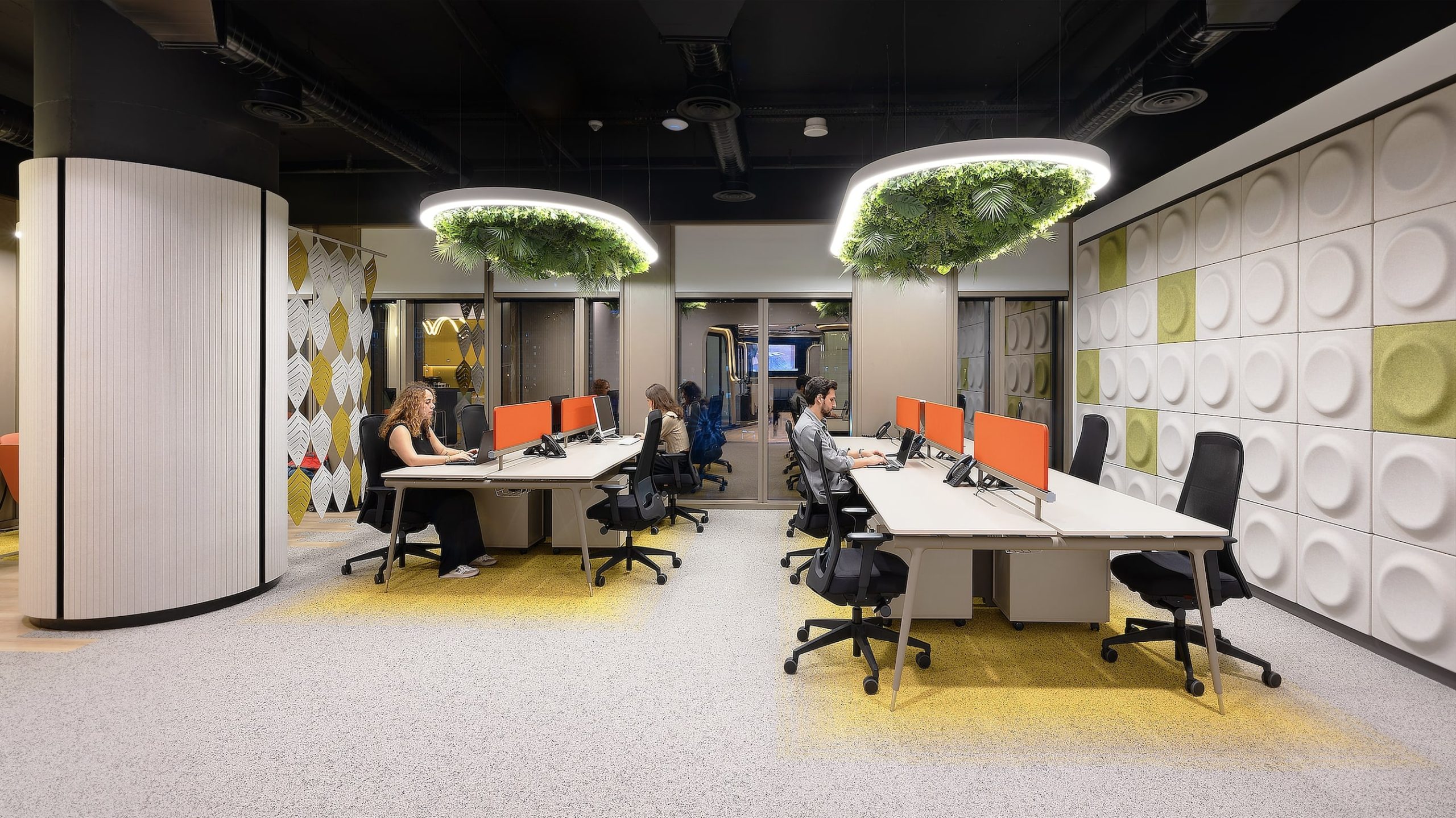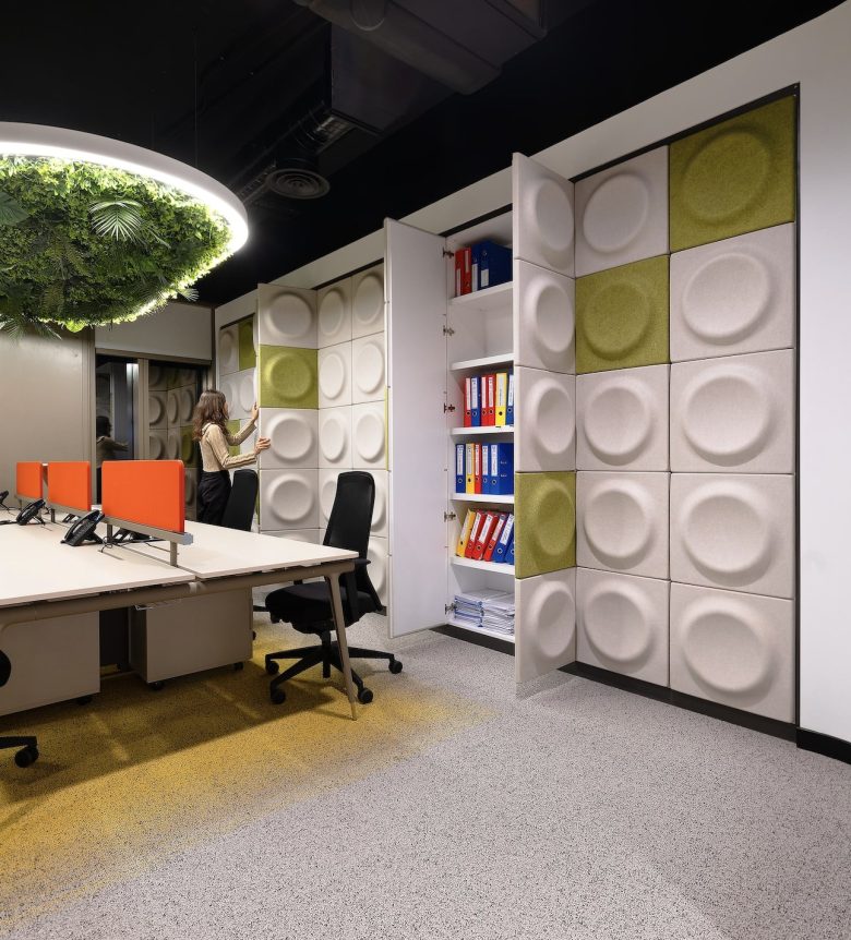 Ofisin kompakt planlaması nedeniyle açık ofis ve sosyal alanlar birbirine yakın konumlandırılmıştır. Bu yakın ilişki, kullanım kolaylığı sağlamak amacıyla kolonlar ve bölücülerle görsel olarak yarı geçirgen hale getirilmiştir. Ayrıca özellikle duvar ve tavanlarda alınan akustik önlemler ses konforu seviyesini önemli ölçüde artırmıştır.