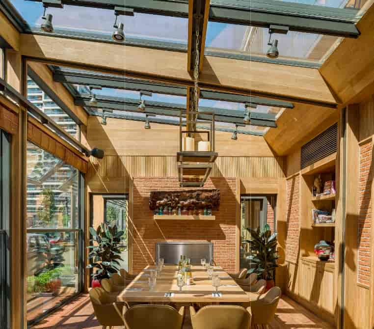 The canopy roof with wooden beam design was inspired by the plane wing section . Thus, terraces associated with the main building, are spreading outwards that makes brightness the terrace area. This roof shape puts Grill Polonez Restaurant in a different position among others.
