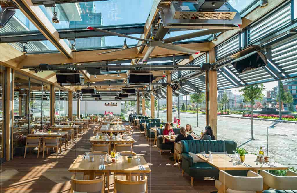 The restaurant is located in relation with the outdoor; it is shaped by an atmosphere that creates familiar and intimate feelings for the user. Grill Polonez Restaurant with 850 square meters area accommodates open and semi open terraces. The seating areas was organized according to different age groups’s requirements with the same design but different units. Thanks to this space, the restaurants can easily accommodate crowded groups. In this way, the spacious place is dissociated into smaller pieces and identities for the person or group of people can embrace the place. The design and layout of the tables and seating groups were carefully chosen to suit every requirement.