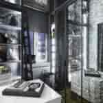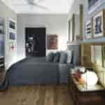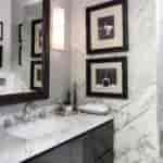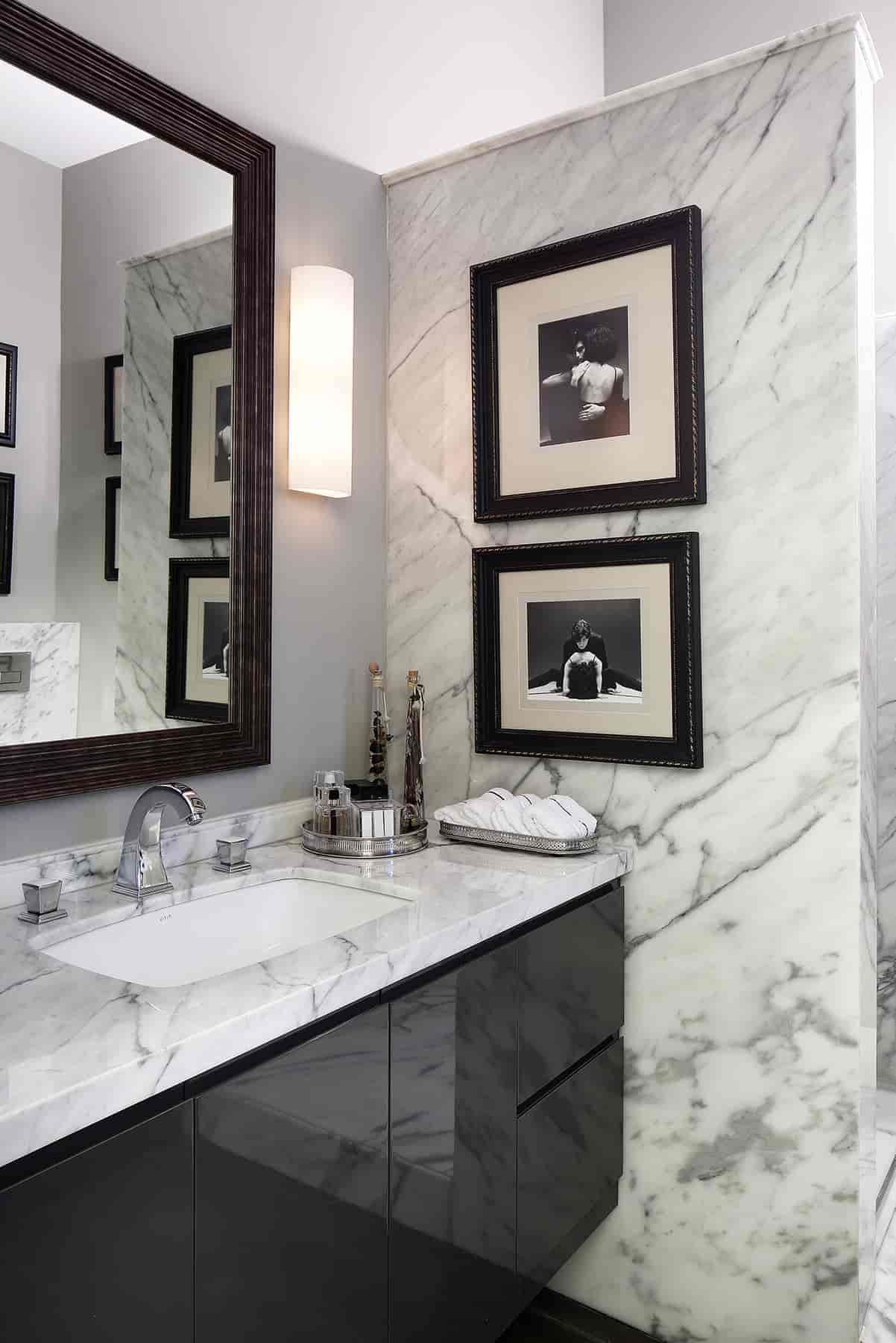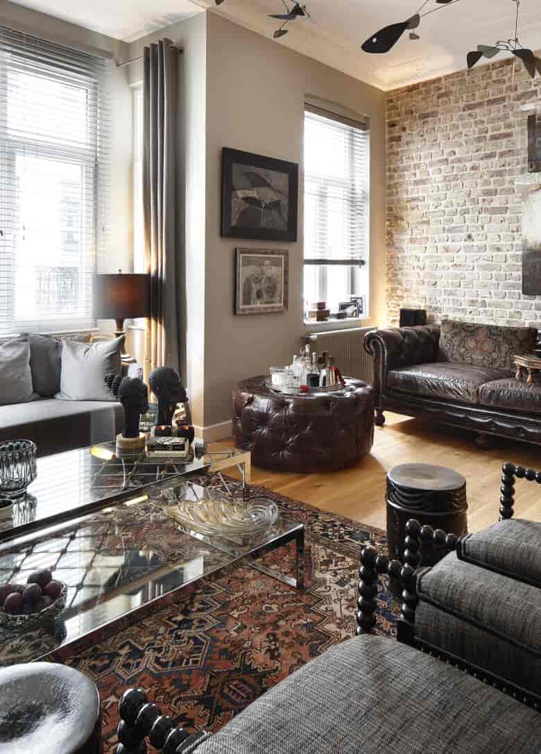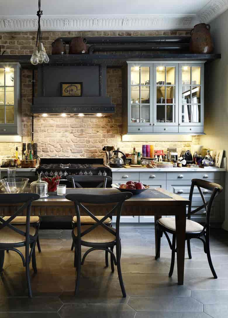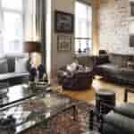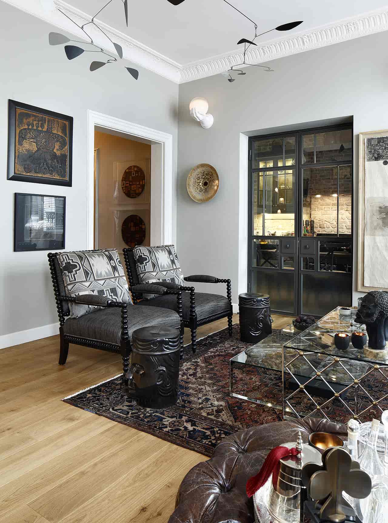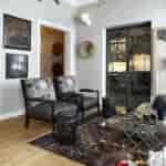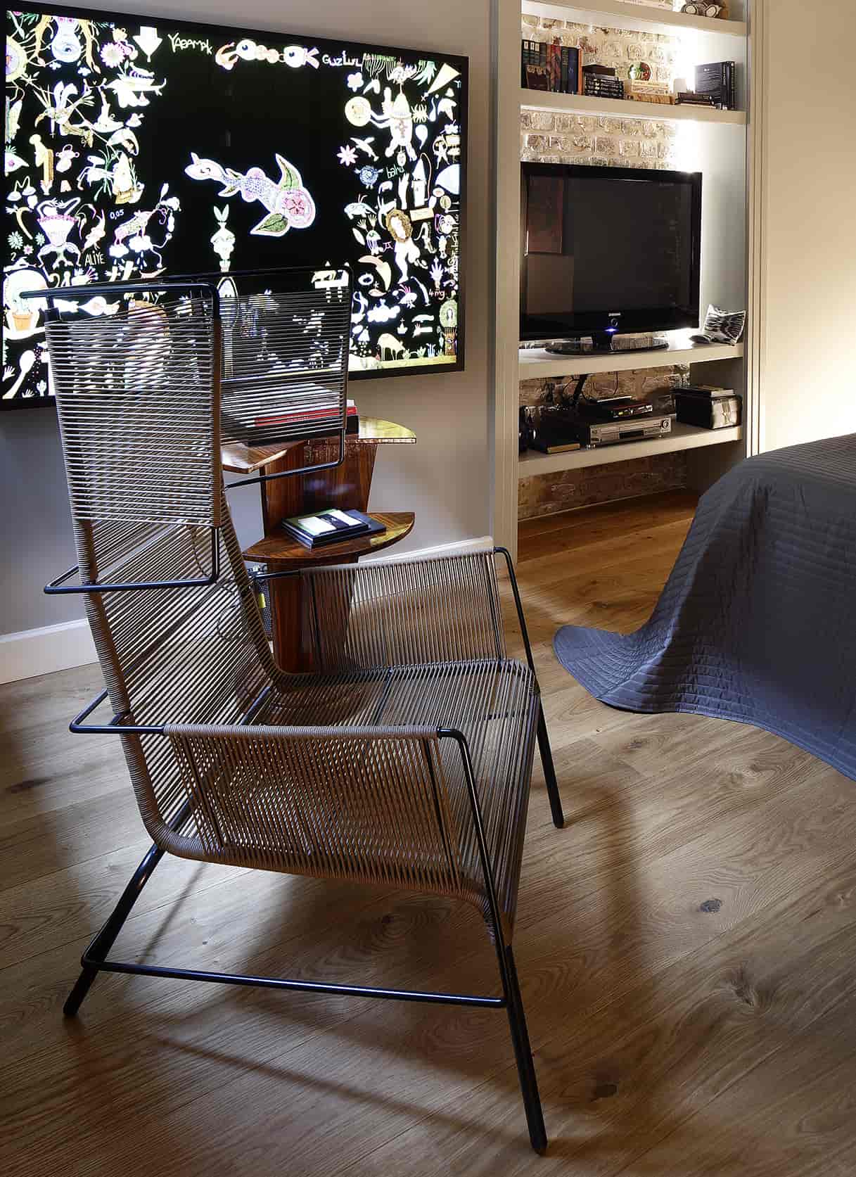 Tamamen soyulan tüm altyapısı yenilenen dairede bazı özel duvarların, işin uzmanı bir ekiple orijinal tuğlalarını çıkardık . Bu özenli çalışmada sırlarını ve tonlamalarını da aynen koruduk. Zeminler de aynı mantıkla masif meşe ahşapla yenilendi. Islak hacimlere de nefti gri el yapımı havasında altıgen formda kale seramikten bir ürün kullandım, calacatta mermer ile bütünleştirerek. Tüm ev yeşile bakan bir gri ile boyanıp eşit fon elde edildi.