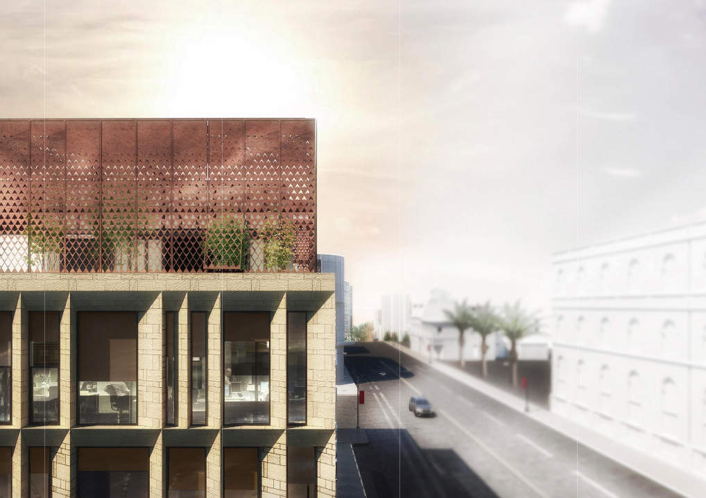 All the executive offices and the spaces that are linked to the executive offices have been settled on the top floor. While the stone cladding facade system has been used as a common usage from all above the building but at the top floor; main box -which contains all the executive Office in it- is hidden behind the perforated zinc panels. This brownish panels are also hiding the perfectly isolated green garden which is connecting the all executive offices to eachother. Jeddah Office Building will have been finalised in 3^rd quarter of 2019.