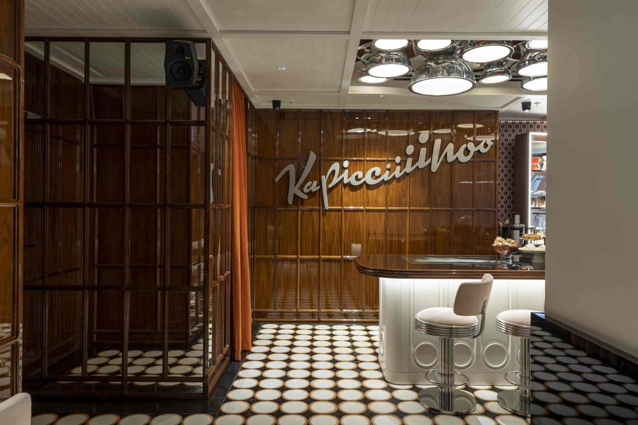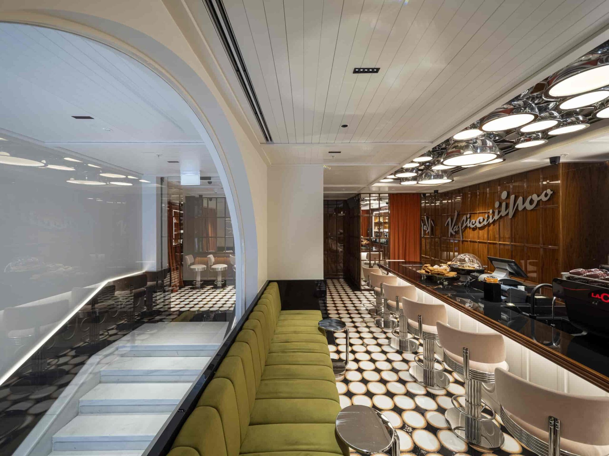 Mekansal kısıtlar sonucu, kahve barı olarak da işlev gören büyük bir ortak masa tasarlanmış ve planlamada maksimum verim sağlanmıştır. Ortak bar masası, tüm gösterinin gerçekleştiği yerdir; KAPICIIIINOO haykırışları, altın kahveler, özçekimler (selfie) ve sosyal paylaşımarı… Masanın arkasında yer alan modern bar-büfe yorumu ise lüks hissine katkıda bulunurken, klasik uslup ile olan bağı güçlendirip, iç mekanlara derinlik katmıştır.