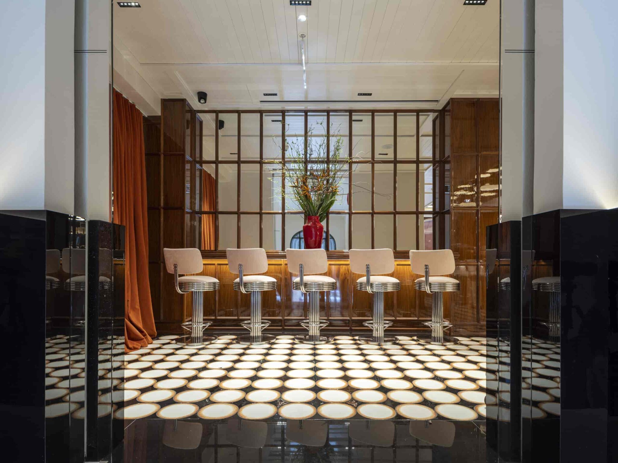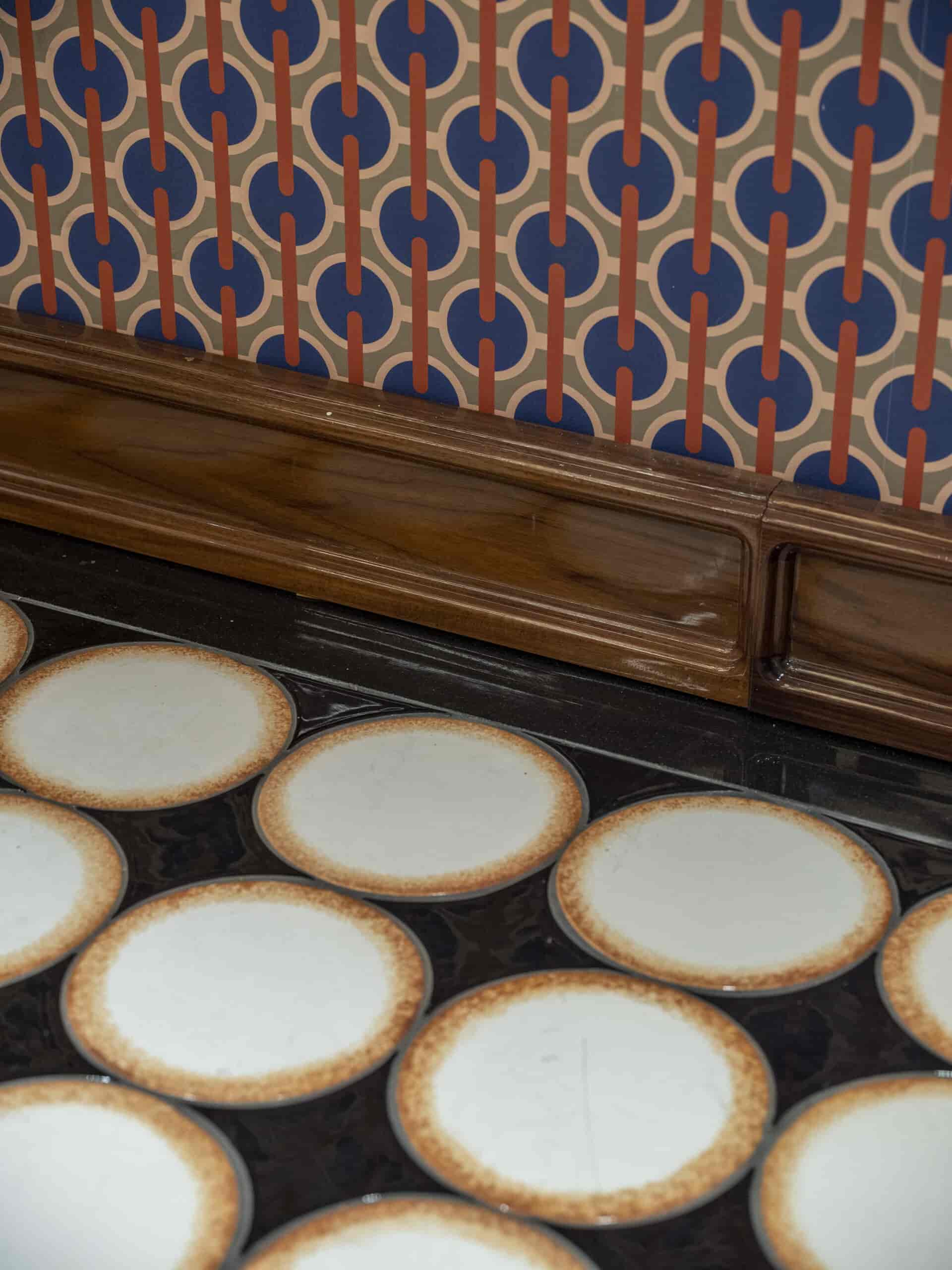 İç mekan tasarımı, yapının mimari özelliklerini ve kahve dünyasından referansları flörtöz bir şekilde harmanlamaktadır. Aynalı duvarlar, klasik tarzda tasarlanmış ahşap çıtalara sahiptir. Aynalar, dar karşılama alanına derinlik katmaktadır. Ahşap panellerin yanında, projeye özgü tasarlanmış retro tarzda, kahve çekirdeklerine gönderme yapan desenli duvar kağıdı, klasik dille uyum sağlayarak eğlenceli bir atmosfer yaratmaktadır.