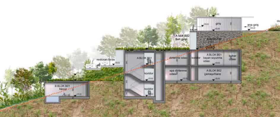 In the project wihch was designed as a healthy hotel especially for children, the planning was done in such a way as to damage the nature in the şeast way. The maximum height in the project is limited to 6 meters and all the buildings were designed in the slope of the terrain and with green roofs. Wood and natural stone are used throughout the project.