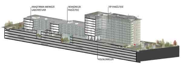 Eğitim ve araştırma amaçlı Tıp Fakültesi, 440 yataklı Üniversite Hastanesi, Hemşire Okulu, İleri Simülasyon Merkezi, yüksek güvenlikli Araştırma Laboratuvarı, Öğrenci Yurdu, Sosyal Tesis ve Spor Merkezi gibi birimlerden oluşan komplekste meslekȋ eğitim ve profesyonel uygulamanın birbirini besleyecek şekilde konumlandırılmasına özen gösterilmiştir. Bu nedenle mekânsal kurgu, eğitim ve araştırma bloklarının hastane bloğu ile görsel iletişimi üzerine şekillendirilmiştir.