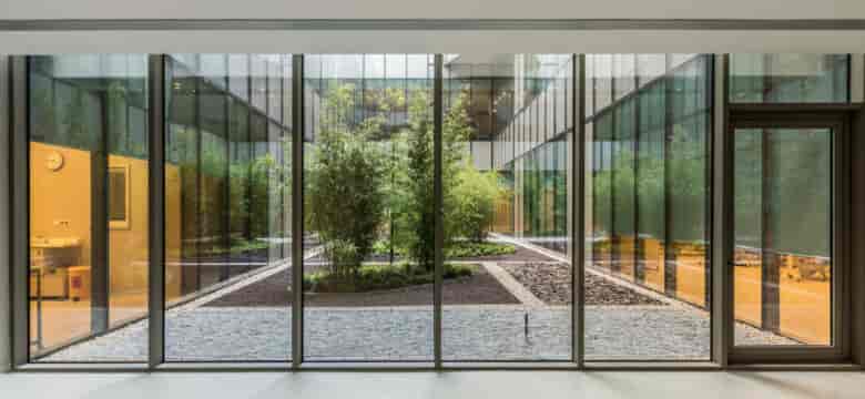 İnce uzun bir arsada yer alan iki dikdörtgen bloktan güneydeki blok daha alçak tasarlanmış ve bir kavisle diğer bloktan uzaklaştırılarak orta avluya ve kuzey bloğuna daha fazla gün ışığı almak mümkün olmuştur.