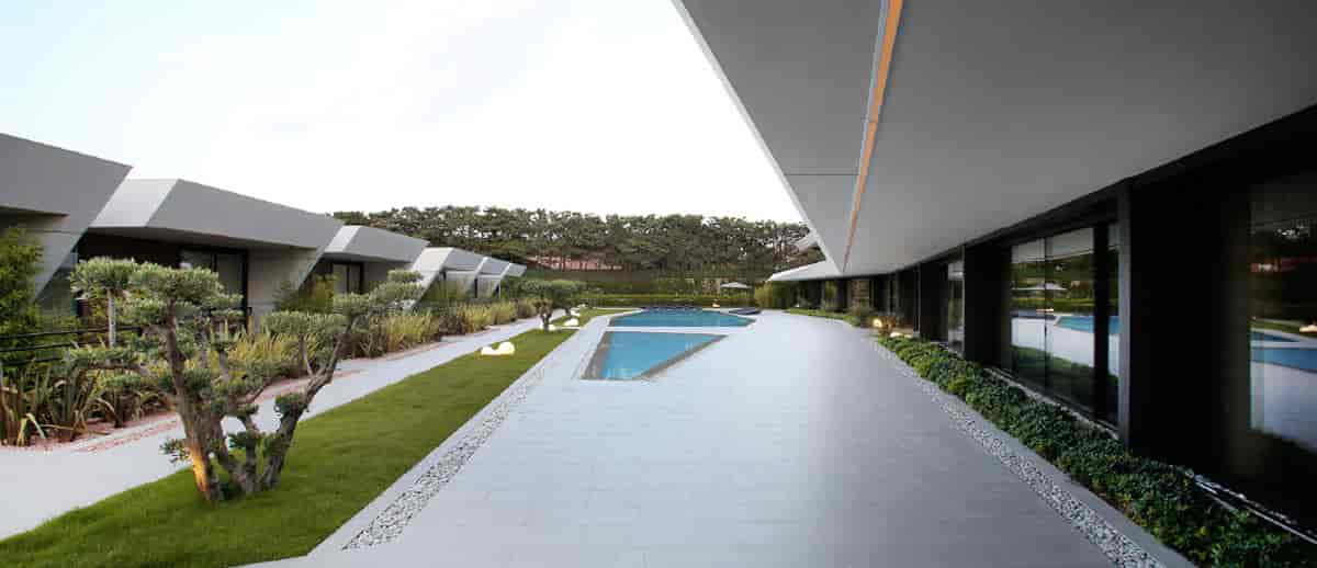 Proje denize sıfır bir konumda olmasının yanında kuzeyden gelen rüzgar dönemleri için korunaklı iç bir avlu oluşturulmuştur. Bu avlu on ve arkadaki ünitelerin birbirleriyle ortak buluşma ve dağılma noktasını oluşturmaktadır. Bu alandan kapalı alandaki, giriş lobisi, sosyal merkez, restaurant, spa gibi birimlere geçilebildiği gibi acık alanda havuz ve termal havuz alanlarını barındırmaktadır.