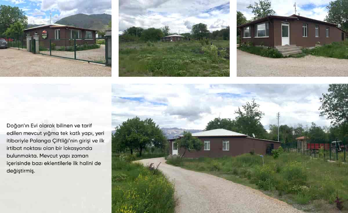 Doğan’ın Evi olarak bilinen ve tarif edilen mevcut yığma tek katlı yapı, yeri itibariyle Palanga Çiftliği’nin girişi ve ilk irtibat noktası olan bir lokasyonda bulunmakta. Mevcut yapı zaman içerisinde bazı eklentilerle ilk halini de değiştirmiş. Yapının iç programı ve kullanım şemasına hiç müdahale edilmeden bir cephe ve kütle yorumu ile ilerlenmiş ve bu çözüm yeterince tatmin edici olmadığı için yeri ve konturu muhafaza edilerek yeni bir yapı önerilmiştir.
