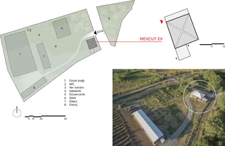 Doğan’ın Evi olarak bilinen ve tarif edilen mevcut yığma tek katlı yapı, yeri itibariyle Palanga Çiftliği’nin girişi ve ilk irtibat noktası olan bir lokasyonda bulunmakta. Mevcut yapı zaman içerisinde bazı eklentilerle ilk halini de değiştirmiş. Yapının iç programı ve kullanım şemasına hiç müdahale edilmeden bir cephe ve kütle yorumu ile ilerlenmiş ve bu çözüm yeterince tatmin edici olmadığı için yeri ve konturu muhafaza edilerek yeni bir yapı önerilmiştir.