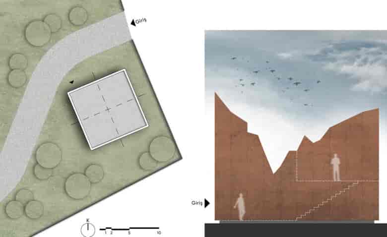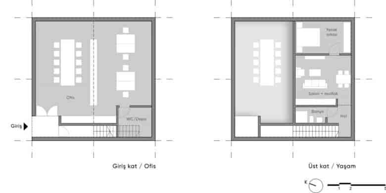 Mevcut yığma tek katlı yapının benzer kullanımı ve ilaveten bir çalışma alanı dâhil edilerek programı genişletilmiş, yüksekliği yorumlanmıştır. Kısmi üst kat yatma ve yaşama alanları ile servislerinin ilave edildiği bir ikametgâh olarak tasarlanmış alt kat ise etüt, çalışma, toplantı için ayrılmıştır. Yapı çeperi korten metal ile giydirilen bir çelik strüktürdür.