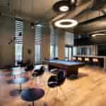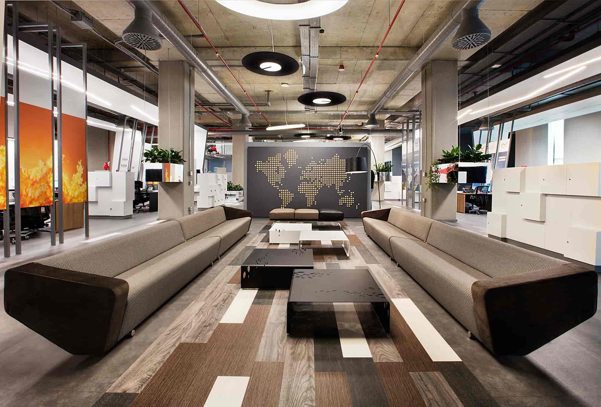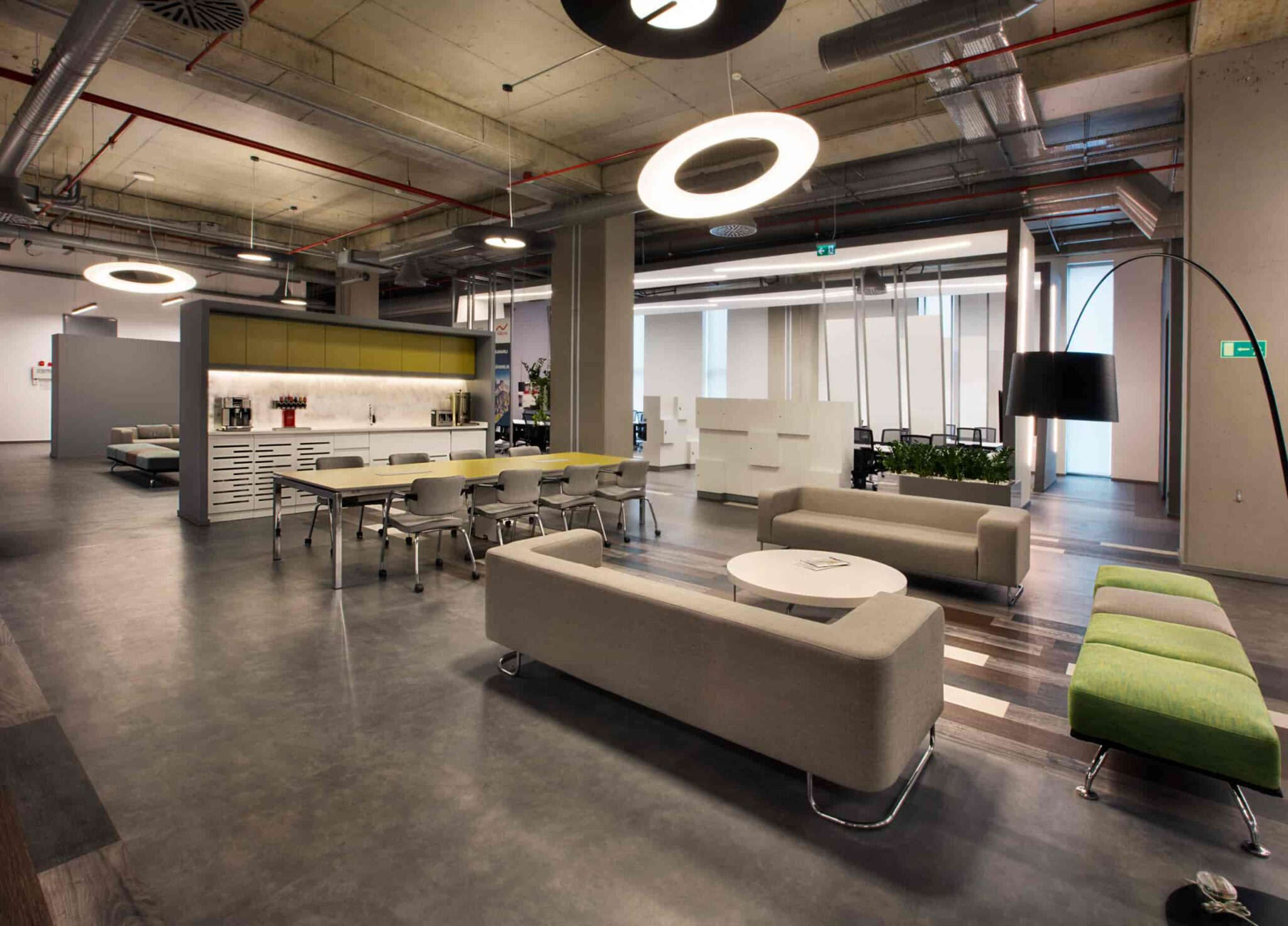Ofisin çalışma alanları arasında yer alan açık toplanma alanları ile ilişkili planlanan içecek ve kopyalama servis noktaları, mekanın günün her saati işleyen alanlar olmasını desteklemektedir. Aynı zamanda çalışanların bu noktalara ulaşımları da oldukça kolaylaştırılmıştır. Bu alanların yanında, katın açıldığı açık teras alanı ile bu teras ile ilişkilendirilmiş yemek ve dinlenme alanı ise tasarımı, malzeme ve renk seçimleri ile dikkat çeken diğer bir bölümdür.