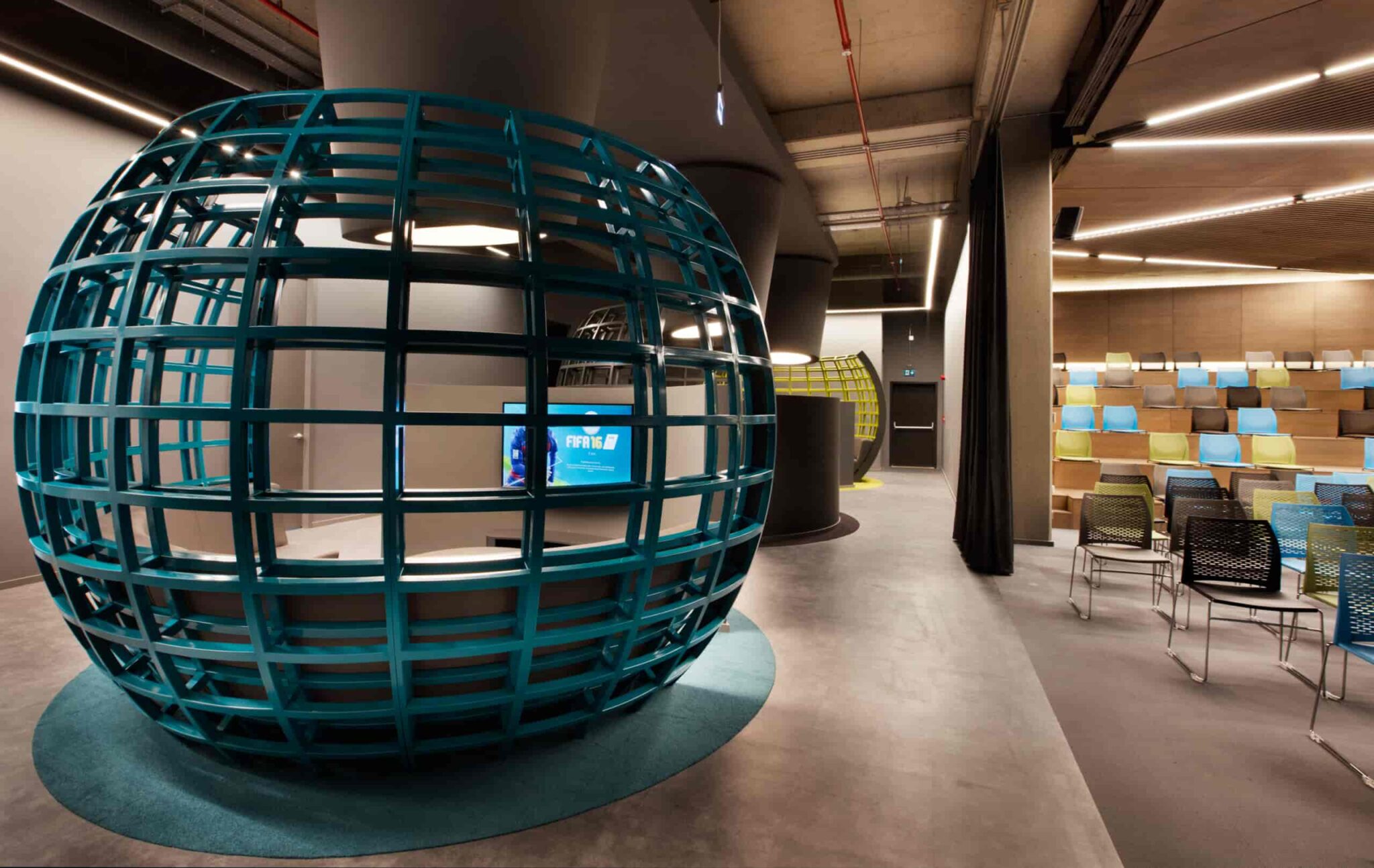Ofisin genelinde nispeten koyu tonlar tercih edilirken, özel ürünler, mobilya, grafik tasarım, peyzaj ve aydınlatma tasarımı ile bu etki dengelenmiştir.