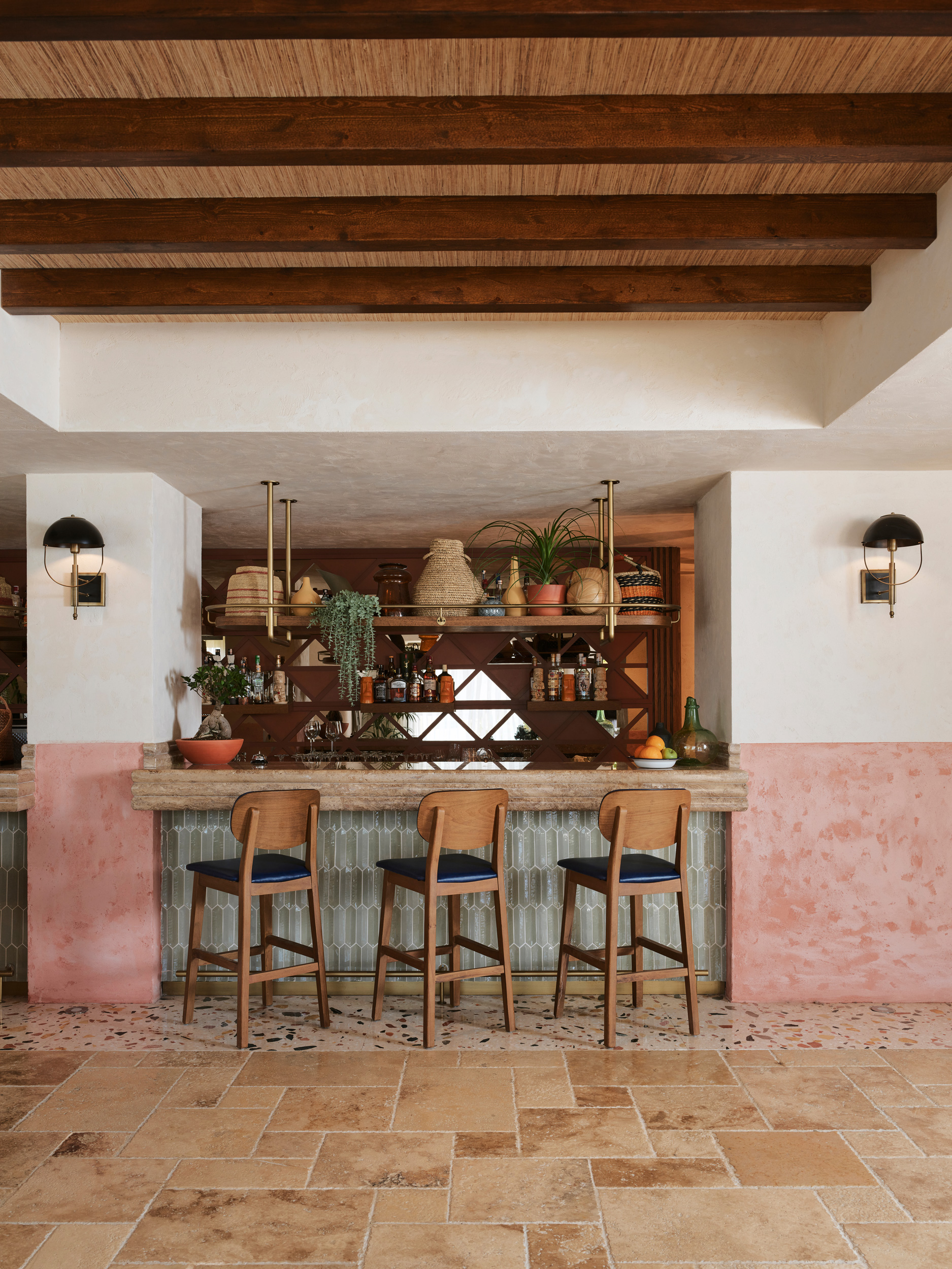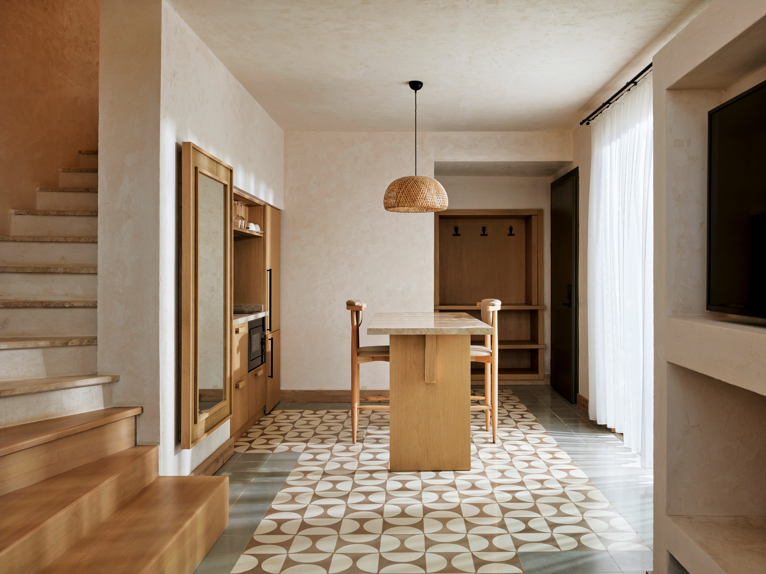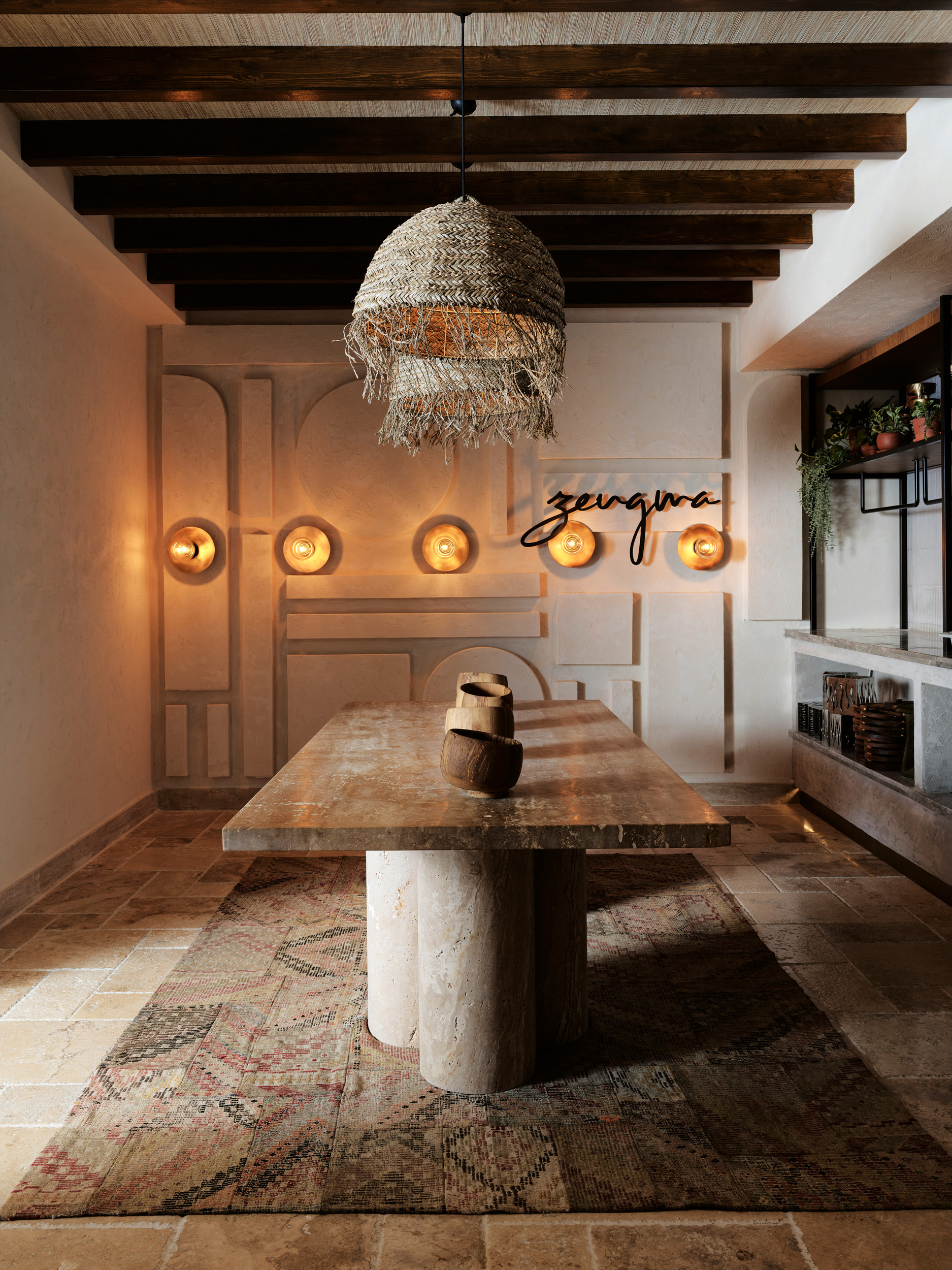 En çok kullanılan malzemeler cam, taş ve ahşaptır. Yapının geçirgenliğini korumak amacıyla tüm cepheler açılabilir cam uygulamalarıyla çevrelenmiştir. Topografinin sunduğu doğal taşlar, özel üretim seramikler ve mermerlerle birleştirilerek zeminden başlayan bir süreklilik sağlanmıştır. İç mekanların neredeyse tamamında ahşap yüzeyler tercih edilmiş, doğal malzemelerin kullanımı iç mekana da taşınmıştır. Tüm malzemeler dengeli bir şekilde bir araya getirilerek mekana daha sıcak bir atmosfer kazandırılmıştır.