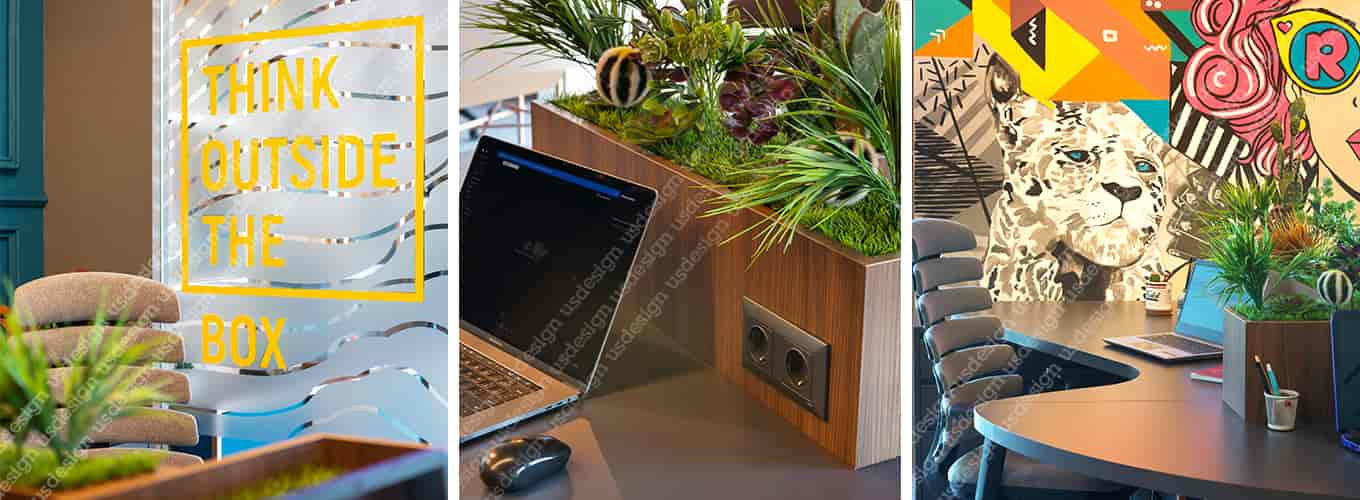 Ofis dekorasyonunda ofisin tasarımına uygun ray spotlar ve lineer aydınlatmalar kullanılarak enerjik bir atmosfer yaratılmıştır. Personel için uygulanan çalışma masalarında bölücü saksılar tasarlanarak, içlerinde konumlandırılan bitkilerle enerjik bir atmosfer yaratılmak hedeflenmiştir. Ofisin ortasında konumlanan taşıyıcı duvar üzerinde Rasyowork şirketinin kurumsal renklerine uygun olarak duvar resmi yaptırılmıştır.