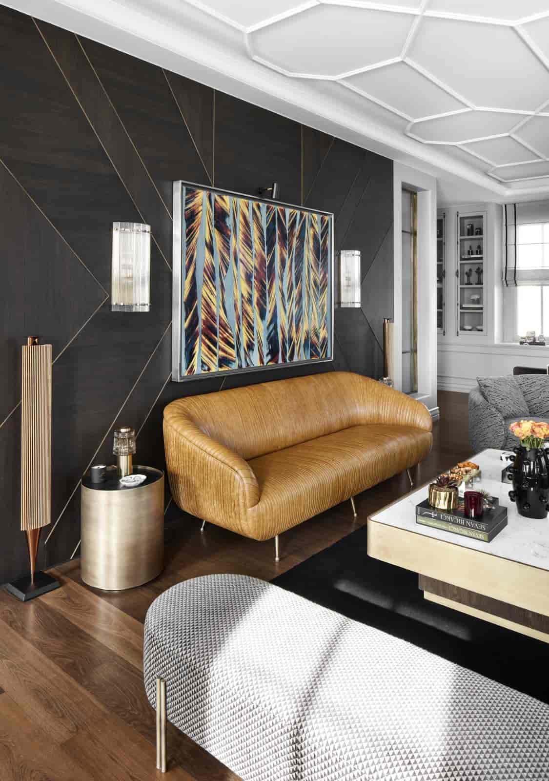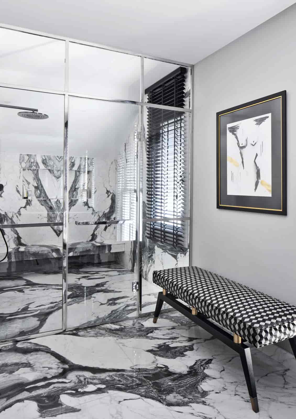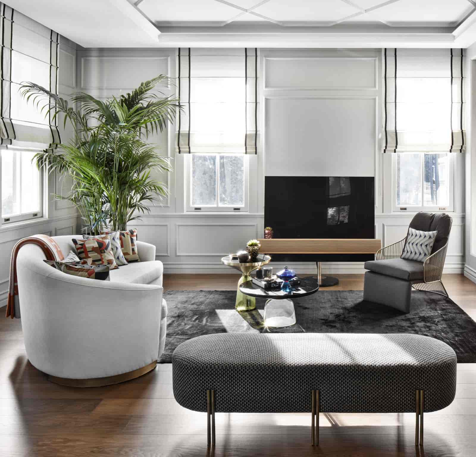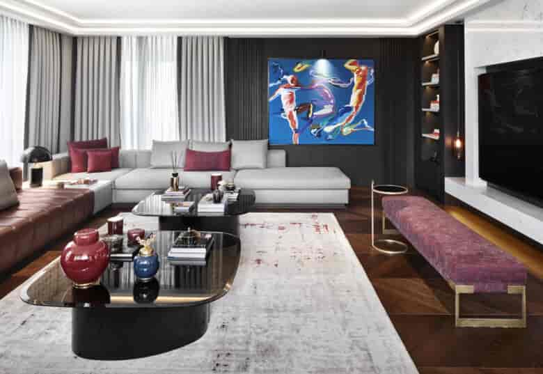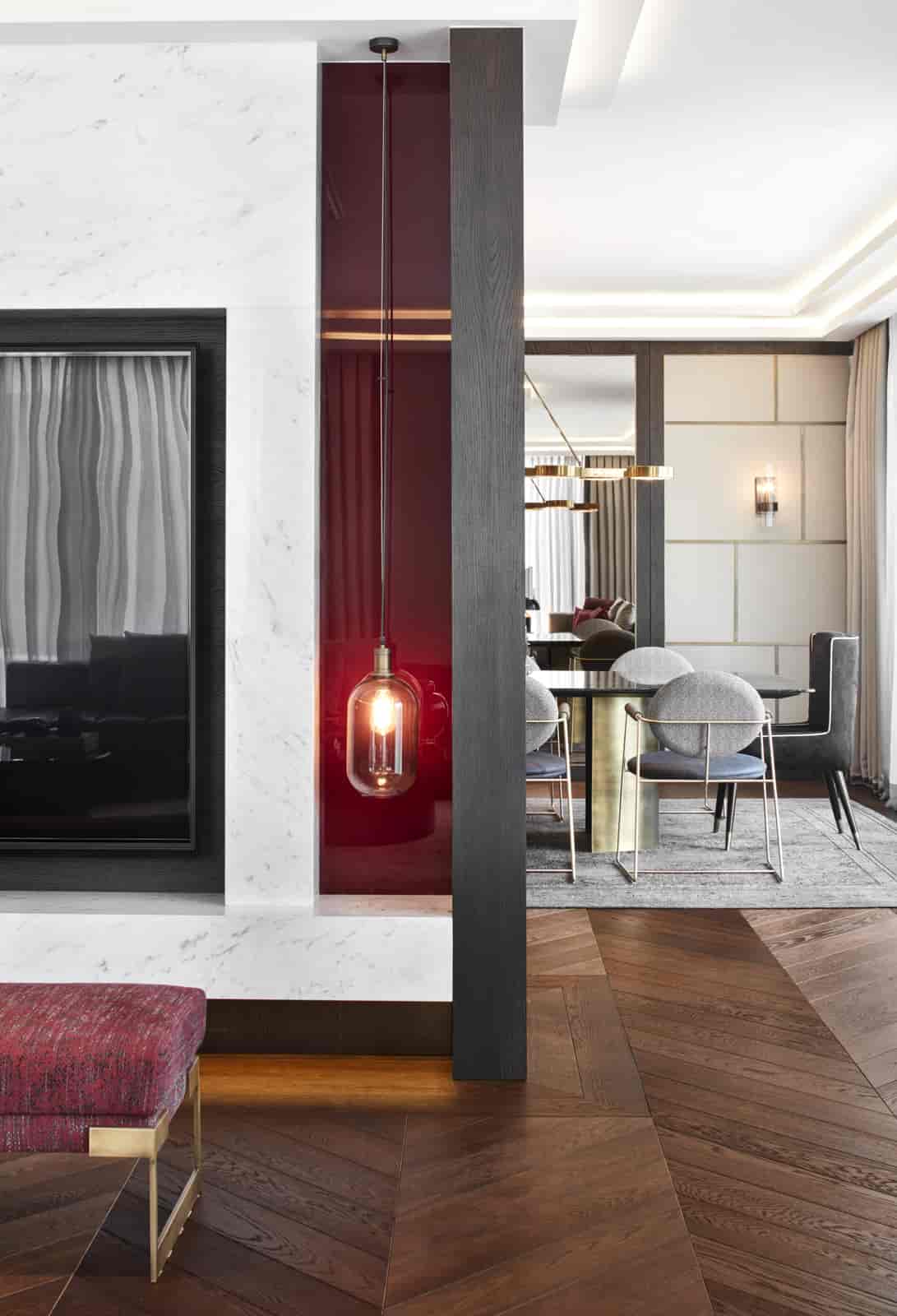 Dekorasyonda dingin renklerin yanı sıra koyu renkler cesurca kullanılmış. “Örnek verecek olursak alt salon katında kırmızı, bordo aksesuar ve tekstil ürünleri kullanılırken, ebeveyn yatak odasında yine aksesuarlar ve tekstil ürünlerinde gri ve mavı renk kullanımına gidildi. Ana salon katında yemek bölümünde mavi ve siyah birlikteliği yaratılırken, oturma bölümünde siyah, hardal ve bej tonları tercih edildi. Evin genelindeki ana renkler ise ekru, siyah ve bronz,” diyen Kazmirci, “Genel aydınlatmalar sıva üzeri ve ankastre olup spotlar ve sarkıtlar ile çözüldü. Bunun yanı sıra dekoratif aydınlatma aplikler ve gizli led sistemi kullanılarak ambiansa şıklık getirildi. Mekanlara göre farklı perde uygulamaları yapıldı, keten perde, kadife perde ve ahşap 50mm jaluzi gibi. Mermer ve parke kullanıldı. Tüm mermer işleri Stoneline, parke ise Lantana firmasından temin edildi. Her iki salonda ipek halı var. Yatak odasında özel imal ettirilen Chevron desen koko halı mevcut,” diye paylaşıyor.