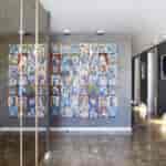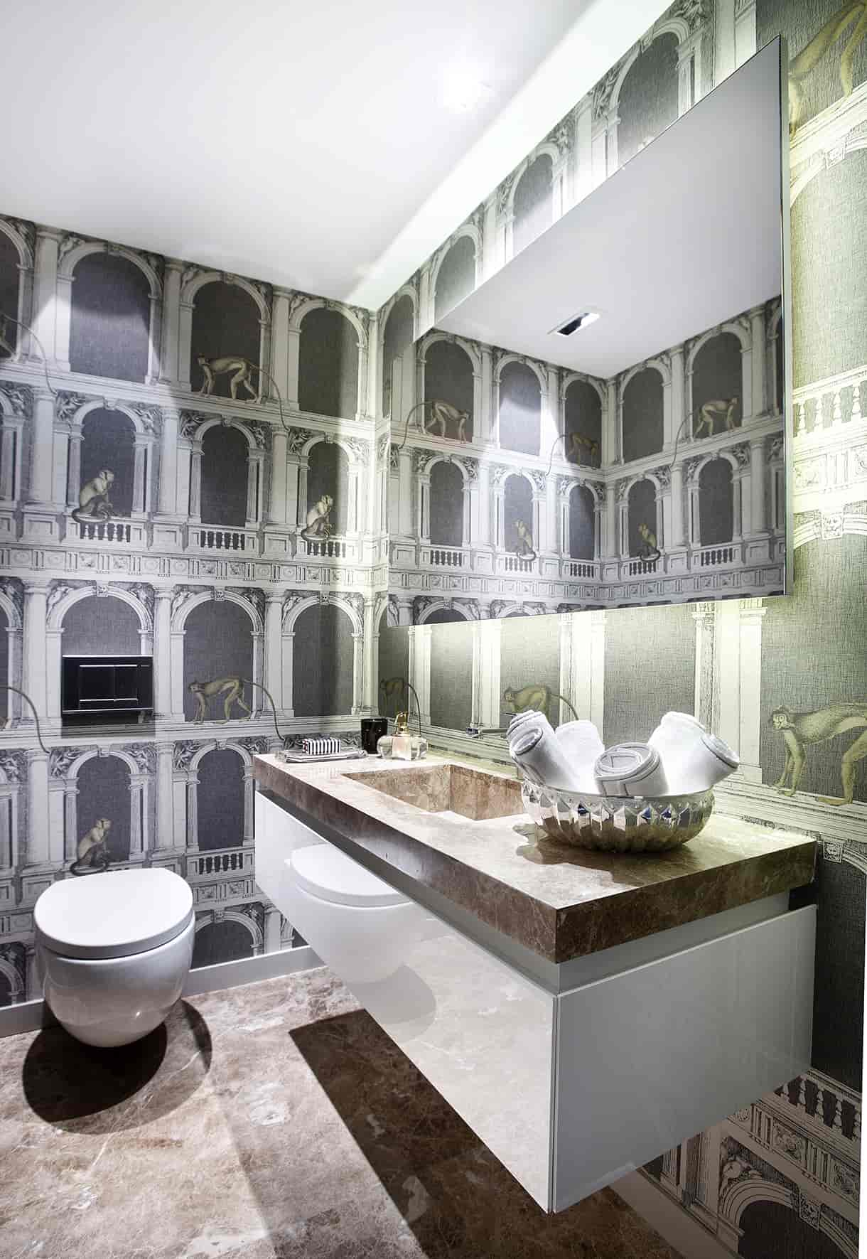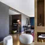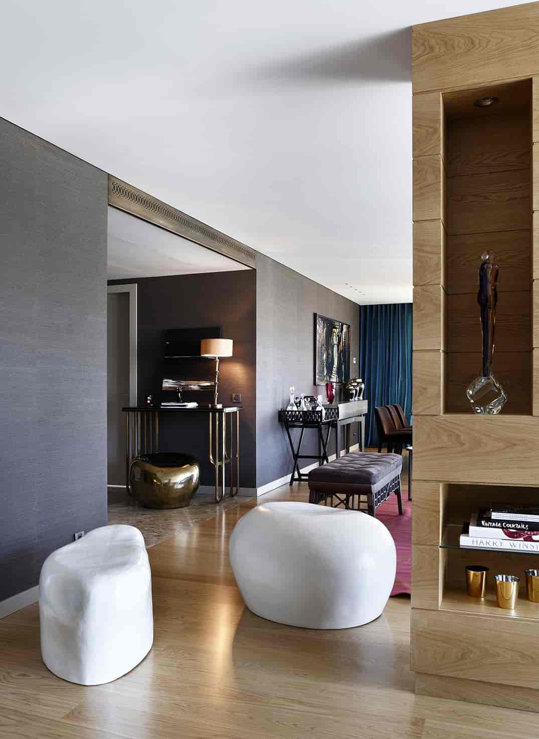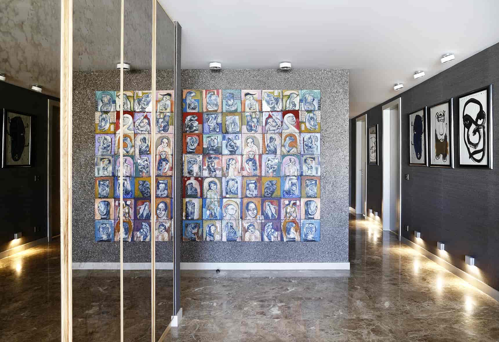 Mobilya seçimlerinde düz ve modern hatlar hakimken, destekleyici parçalar, biraz da vurgu vermek adına klasik kullanıldı. Evin genelinde duvarlar bir galeri edasıyla Modern sanat eserlerine ev sahipliği yapıyor.