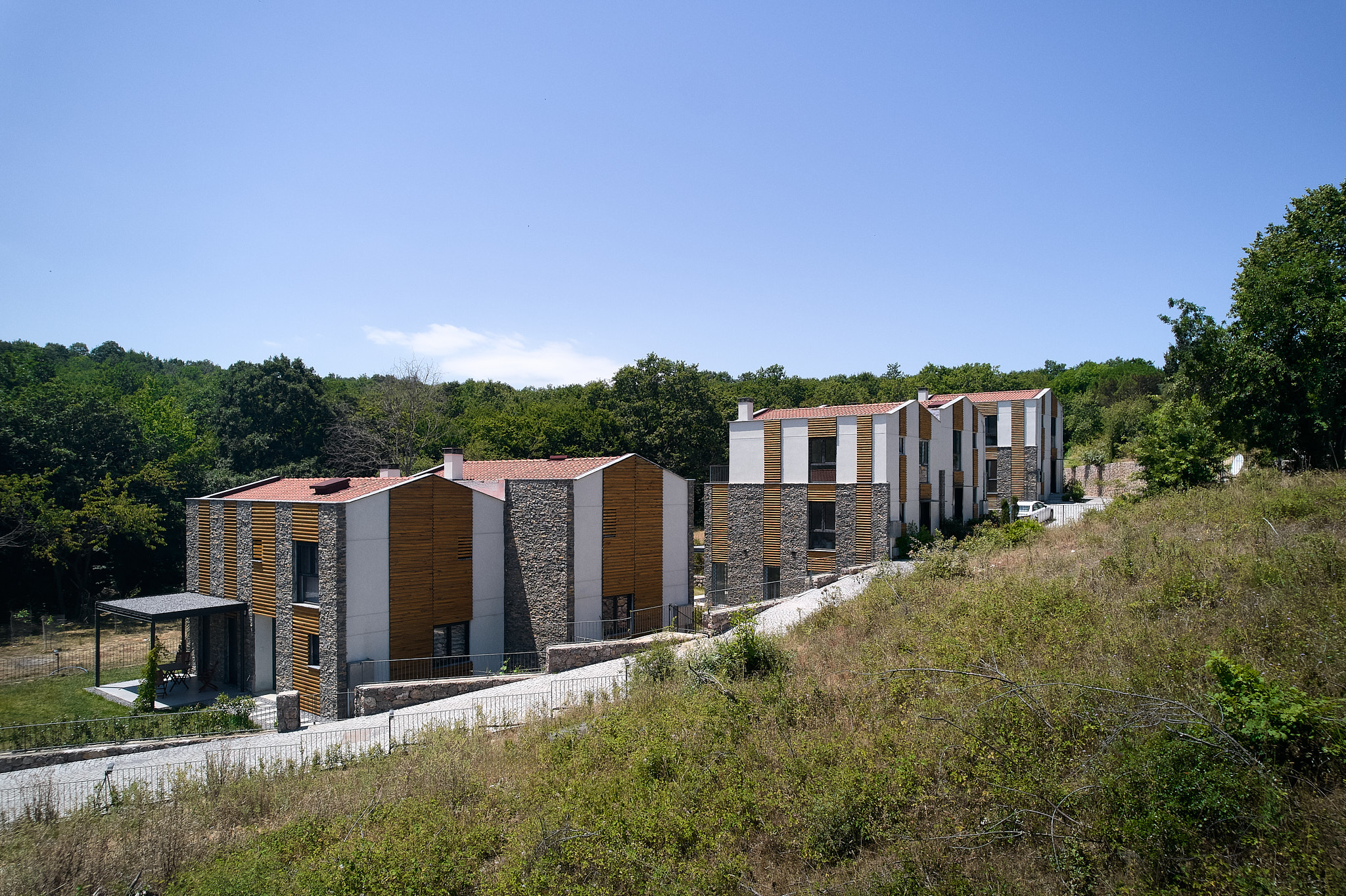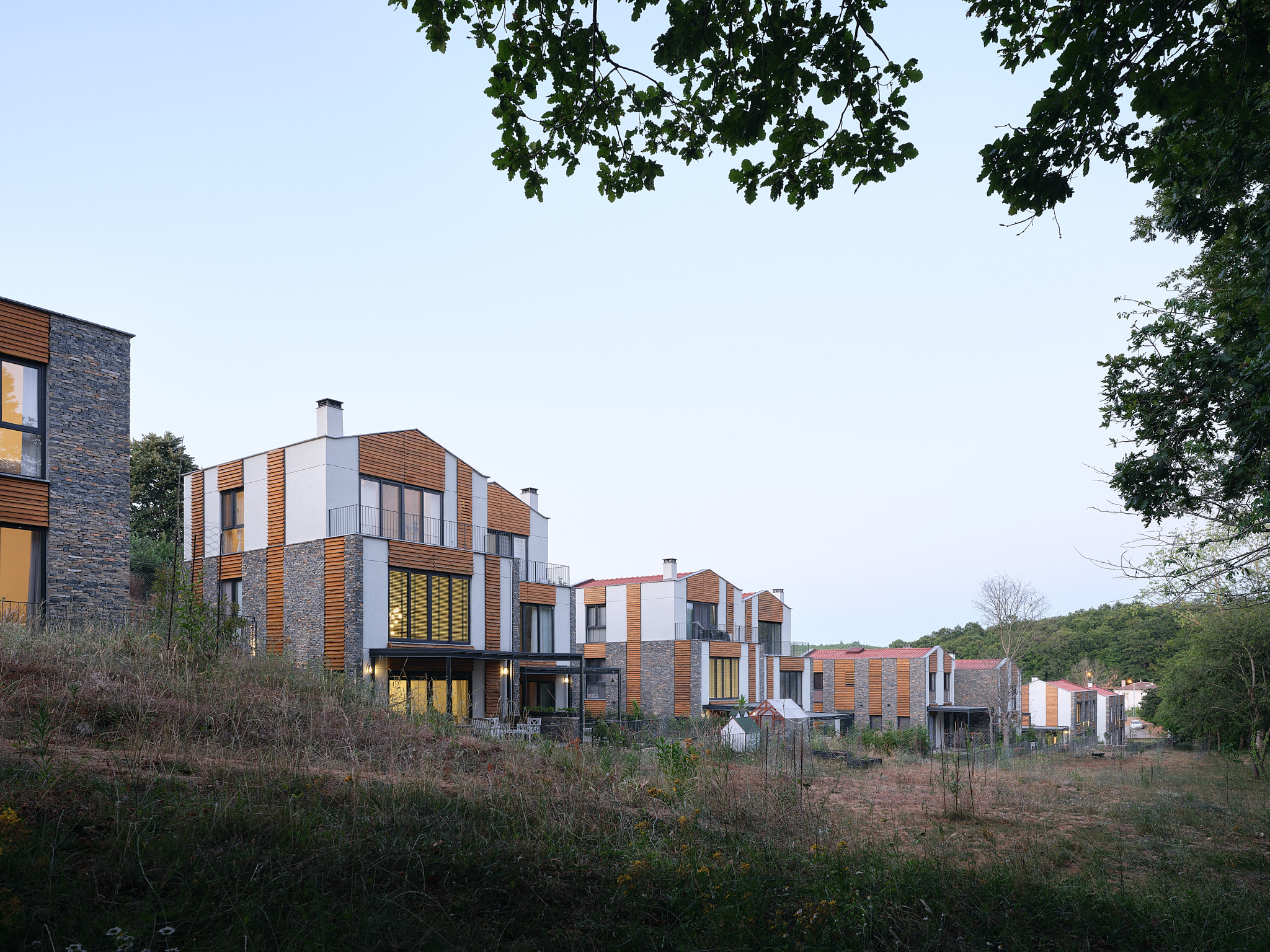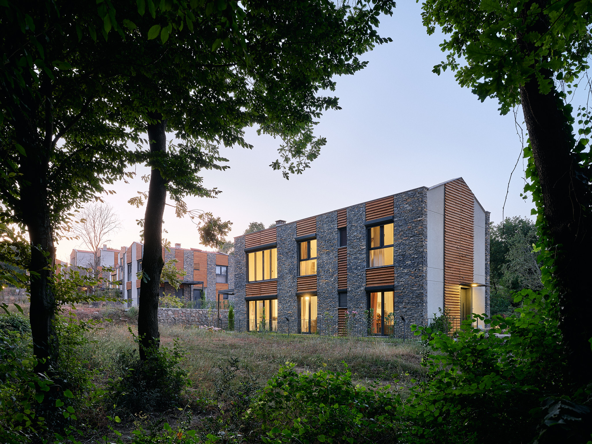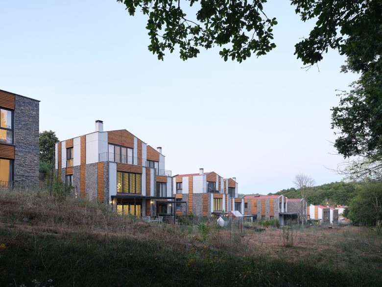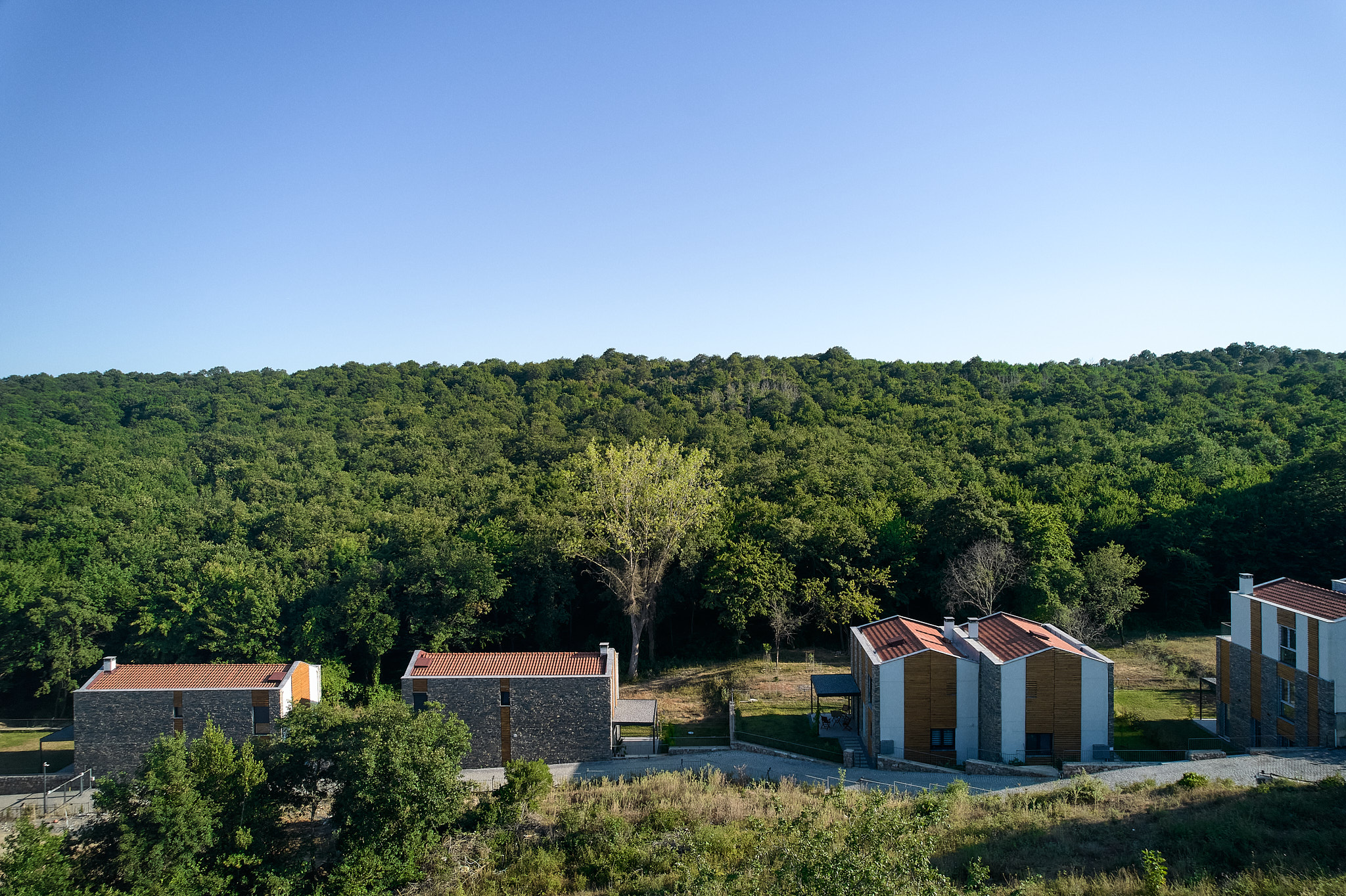 İlk sitedeki tüm villalar ormana bakmaktadır. Arazinin uçlara doğru daralan formu nedeniyle, A tipi villalar, arazinin uzun kenarına paralel olarak konumlandırılmıştır. Buna karşılık, arazinin derinliğinin arttığı orta kısımda, B ve C tipi villalar, uzun kenara dik olarak, ormana yönelmiş şekilde yerleştirilmiştir. Araç erişimi arka tarafta tutulmuş, böylece bahçelerle orman arasındaki bağlantının serbest kalması sağlanmıştır.