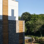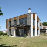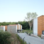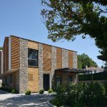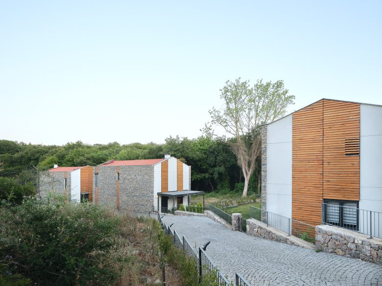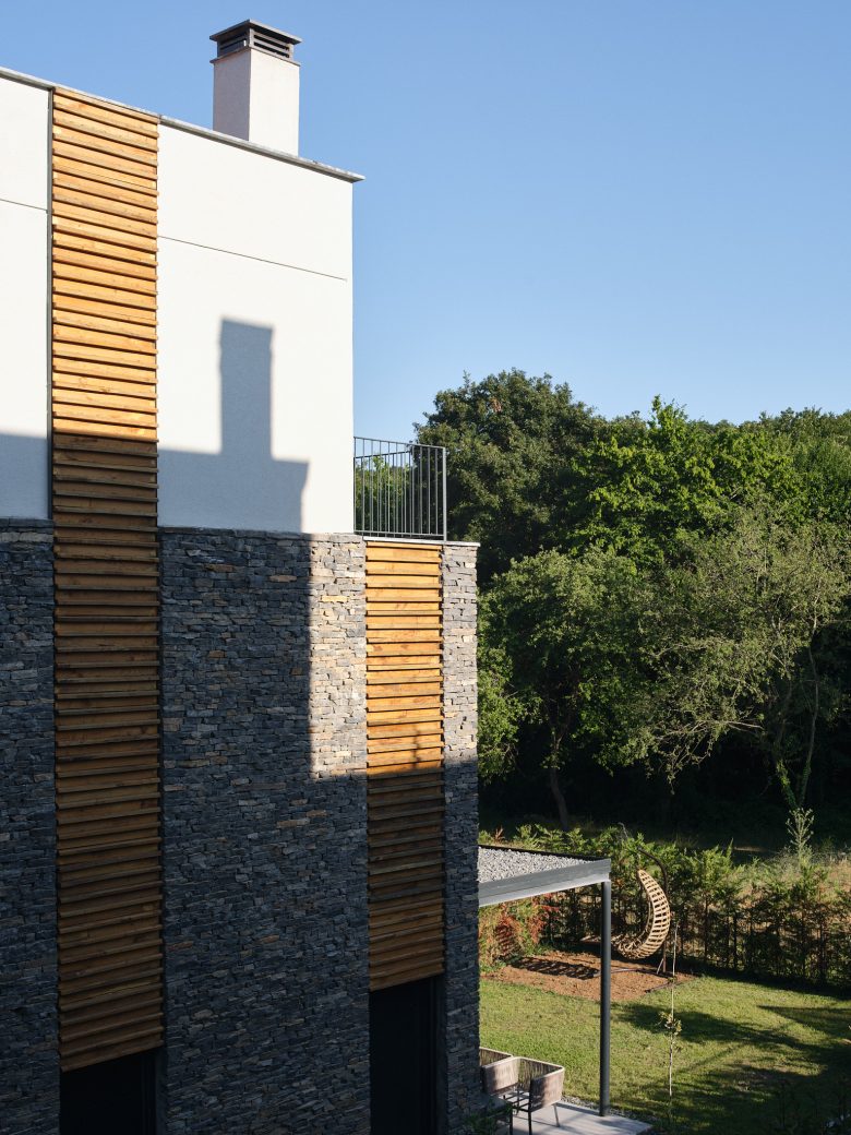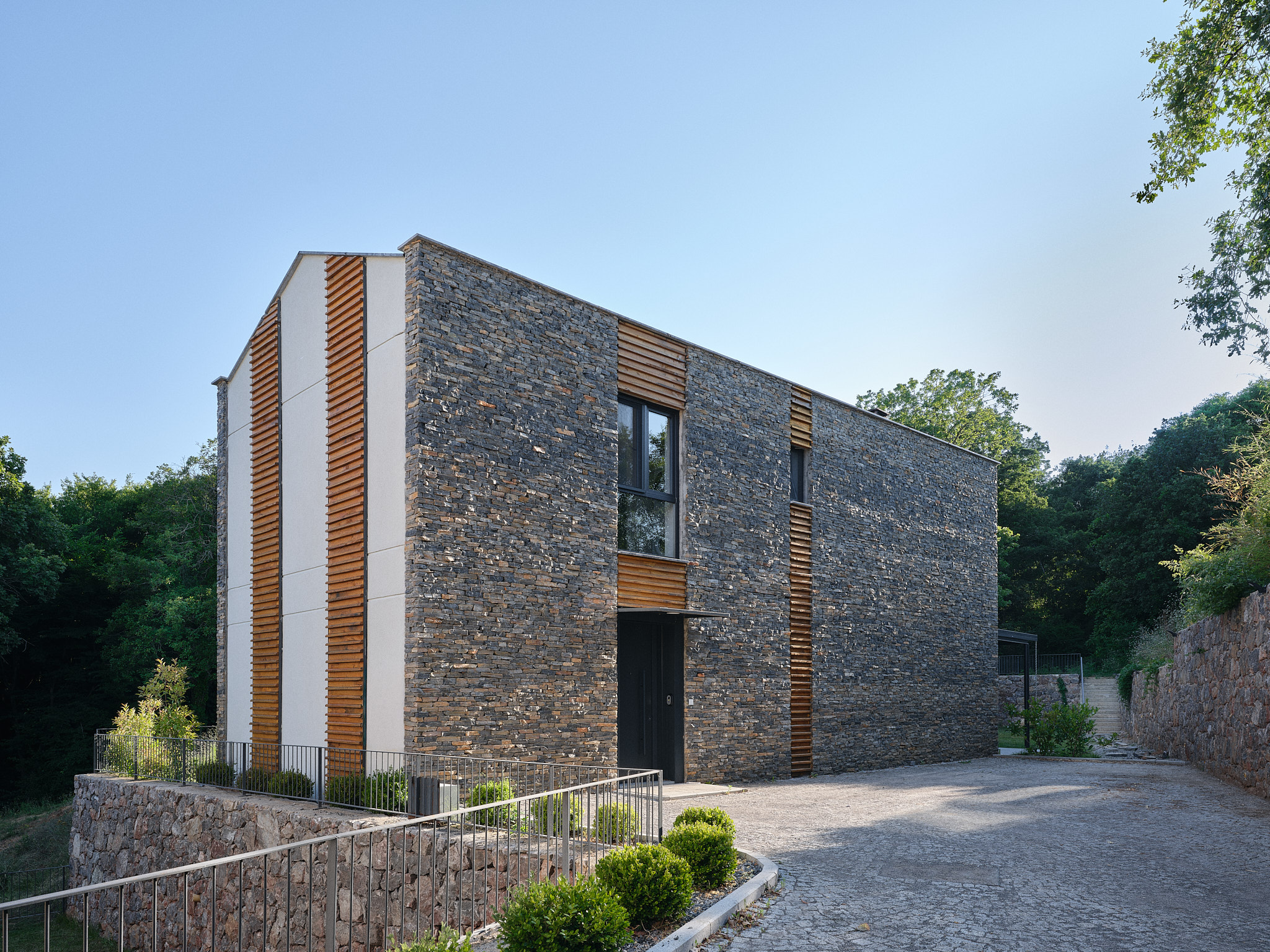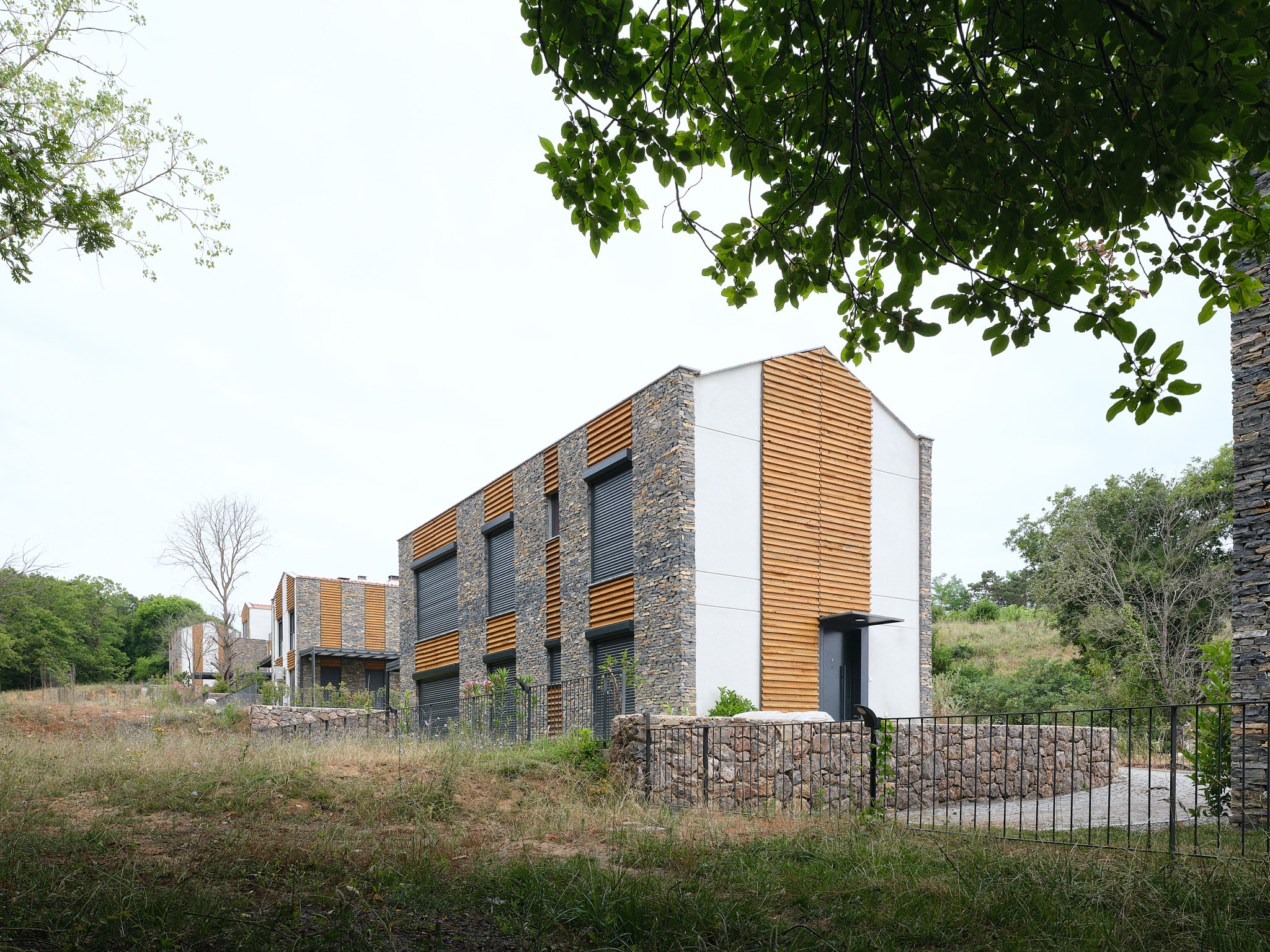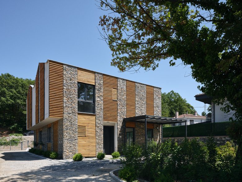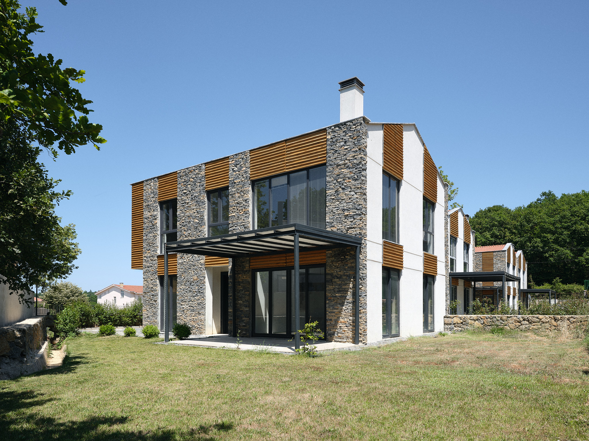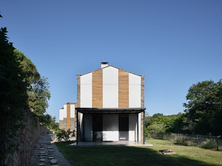 Toplam on üç villanın tamamı aynı malzeme paletini kullanmaktadır: Yan duvarlar kayrak taşı ile kaplanmış, ön ve arka cephelerde ise gözenekli sıva ve kirli beyaz boya tercih edilmiştir. Pencereler düşey ahşap bantlarla vurgulanmıştır; bu ahşap bazen cephe kaplaması, bazense güneş kırıcı olarak kullanılmıştır. Kestane ağacından ahşap lataların ve kayrak taşlarının yataylığı arasındaki benzerlik, algının dengelenmesini sağlar. Tüm villalarda, çelik taşıyıcılı ve üzeri örtülü verandalar bulunmaktadır.