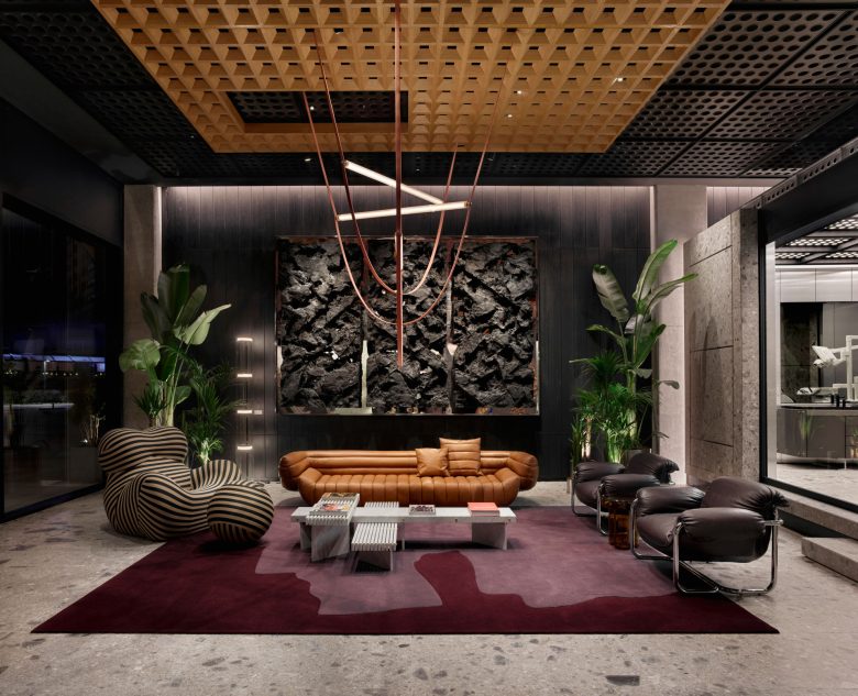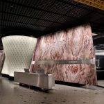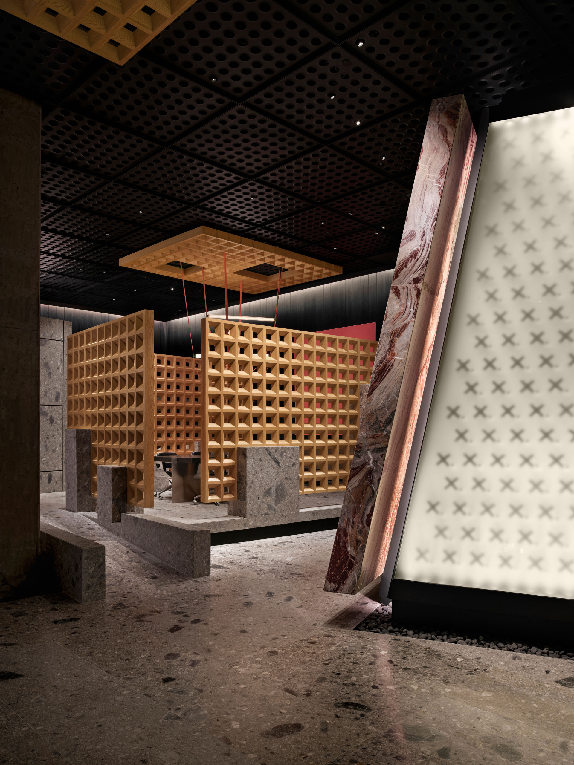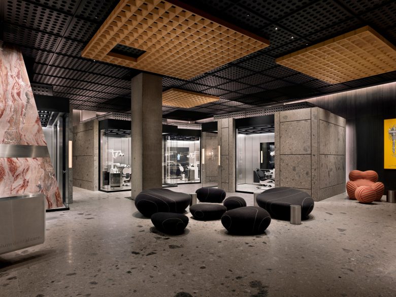 Zemin ve duvarlarda yeniden kurgulanan gri doğal taş, toprağın içinden yükselen monolitik formlara evrilirken; sahnenin arka planı gibi duran siyah meşe, duvarlarda belirerek mekâna dingin ve sofistike bir ritim katıyor. Taş bloklar kusursuz ve yekpare bitişleriyle süreklilik ve birlik duygusu yaratırken, farklı hiyerarşi ve oranlarda konumlandırılarak toplantı odaları, danışma alanları ve doktor ofislerine dönüşen aralıklar oluşturuyor. Karşılama alanında doğal kırmızı taş ve camın buluşmasıyla sağlamlık ile kırılganlık, kalıcılık ile hafiflik arasında bir diyalog kuruluyor. Taş, durağan değil; eğilmiş, yerinden oynamış ve adeta topraktan yükseliyormuş gibi kurgulanarak heykelsi ve akışkan bir unsur hâline geliyor. Bu karşıtlık, malzemenin sınırlarını sorgularken markanın cesur ve alışılmadık karakterini yansıtıyor.