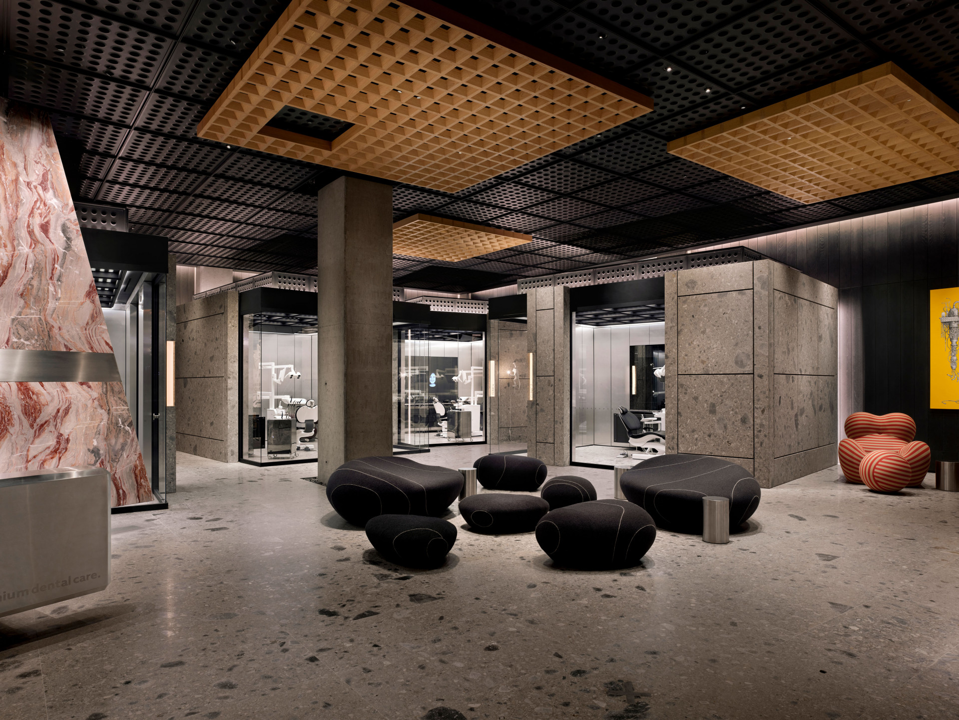 Smiles, kavramsal olarak bir diş kliniğinden ziyade bir restoran, otel ya da kulüp gibi ağırlama kültürünü benimseyen bir mekan olarak konumlanıyor. Hastalar birer misafir gibi karşılanıyor; açık, dingin ve ilham verici mekânlarda korkutucu değil, davetkâr bir deneyim yaşıyor. Serbest plan prensibiyle tasarlanan mekânda taş kaplı hacimler bağımsız birimler olarak işlev görüyor. Kimi zaman mahremiyet sağlıyor, kimi zaman sergi duvarlarına dönüşüyor. Bu akışkan kurgu, geçirgenlik ile izolasyon arasında dengeli bir ilişki kurarak kapsayıcı ve konforlu bir ortam yaratıyor.