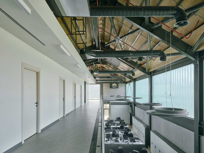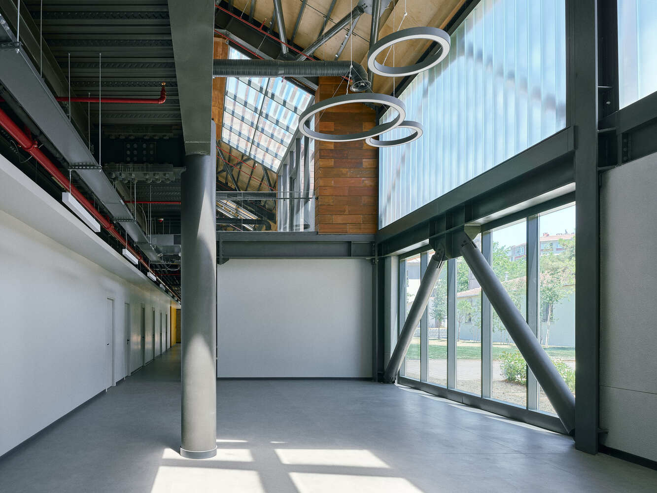 Zemin kat ve bir yarım asma kattan oluşan yapılar, geçici ofis fonksiyonuna hizmet verebilmek adına hafif ve ekonomik bölme elemanlarıyla oluşturulmuş kapalı yönetici ofislerinden ve galerilerle zenginleştirilmiş açık ortak çalışma alanlarından oluşmaktadır. Yapılar, ofis olarak hizmet verdikten sonra içerdeki geçici bölme elemanları ve asma tavanlar sökülerek, bölüntüsüz total mekanlar haline getirilip sanat galerisi fonksiyonuna hazır hale getirilecektir. Küratörün taleplerine veya serginin konseptine göre mekan, bütüncül bir alan olarak kullanılabilir ya da yeniden bölünebilir durumda olacaktır. Bu sebeple tüm elektrik ve mekanik aksamlar, her iki fonksiyona da uyum sağlayabilecek kapasitede ve yerleşimde tasarlanmıştır. Hem ofis hem de sanat galerisi fonksiyonunda hizmet verecek olan ıslak hacimler ve teknik hacimler gibi kalıcı mahaller, yapı içlerinde renkli “box”lar olarak tasarlanmıştır. Beş yapıda beş farklı renk ile simgelenen bu renkli kalıcı “box”lar, tüm alanı deneyimleyen kullanıcıların tekrara düşmesini engellemek amacıyla simgesel birer nirengi noktası olarak düşünülmüştür.