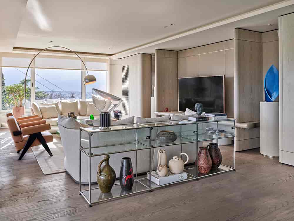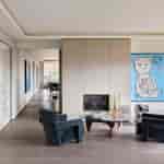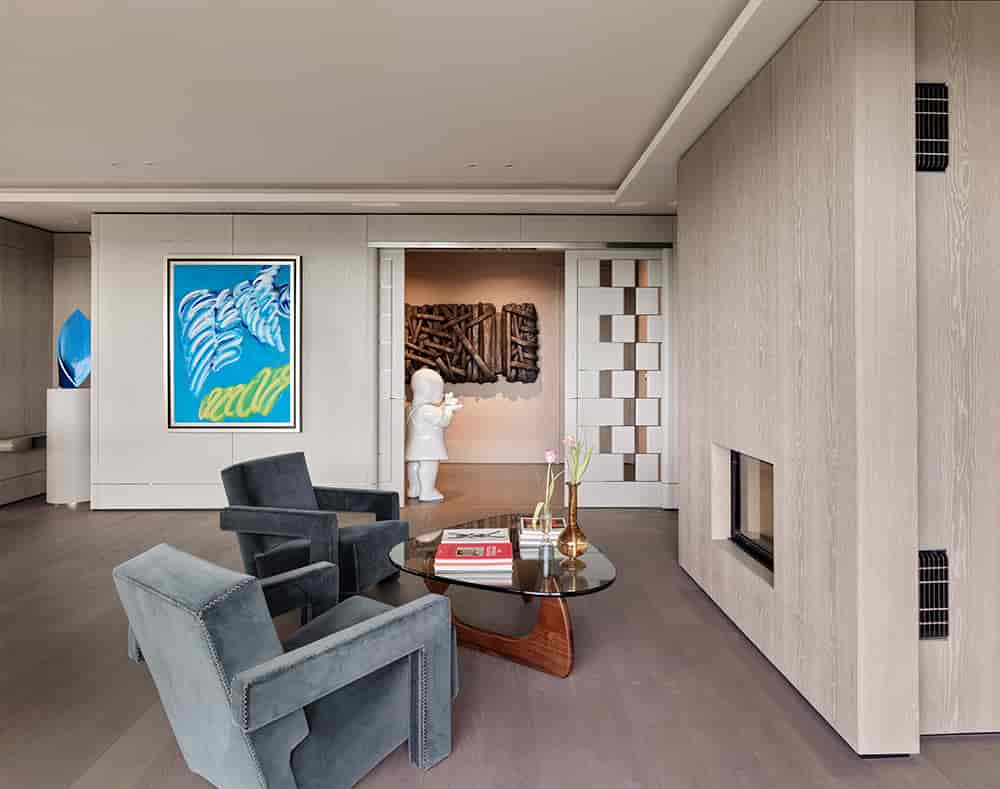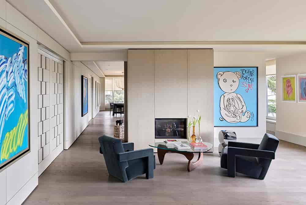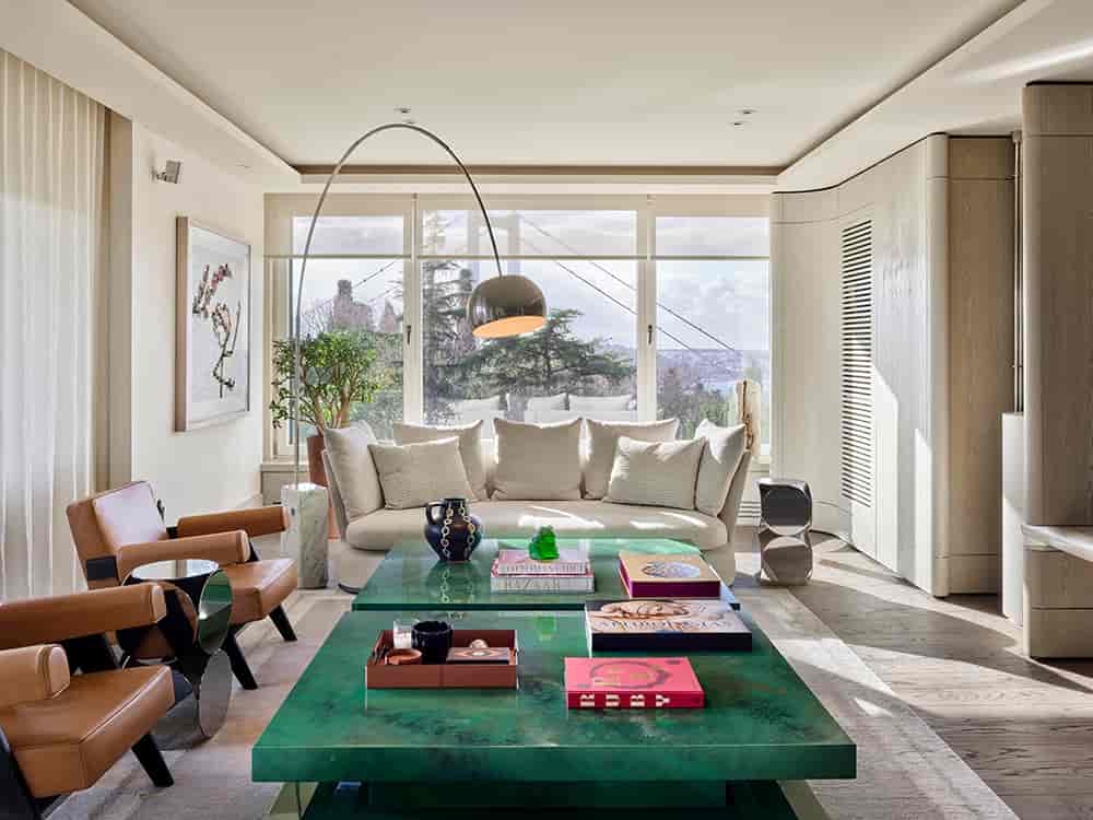 Beyaz renk tonlarının hakimiyetindeki yaşam alanında, salonun duvarlarını kaplayan bej ahşap paneller escapefromsofa tarafından tasarlandı. Salonun yemek odası kanadında escapefromsofa imzalı yemek masasına Cassina sandalyeler eşlik ederken bu alan Moooi marka sarkıt aydınlatmalar ile tamamlandı. Bu kanadın şömine etrafındaki oturma alanında, Mozaik’ten alınan B&B Italia kanepe ve koltuklar, Atelier 1976 imzalı sehpalar ile birlikte kullanıldı. Salonun oturma alanı kanadındaki TV ünitesi, escapefromsofa tarafından projeye özel olarak tasarlandı. Cassina marka camel tonu koltuklar, Maxalto marka beyaz kanepeler ve Rezzan Benardete Interiors imzalı orta sehpa ile birlikte kullanılırken, bu kompozisyona kanepenin arkasında yer alan USM marka cam dresuar eşlik etti. Bu kanadın şömine etrafındaki oturma alanında ise Cassina koltuklar, Mozaik’ten alınan Noguchi Coffee Table ile birlikte kullanıldı. Yatak odalarındaki mobilyalar escapefromsofa tarafından proje için özel olarak tasarlandı. Haluk Akakçe, Ayla Turan, Ömer Uluç ve Seçkin Pirim, yaşam alanında işlerine yer verilen sanatçılar oldu.