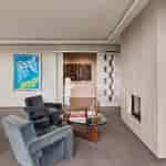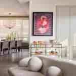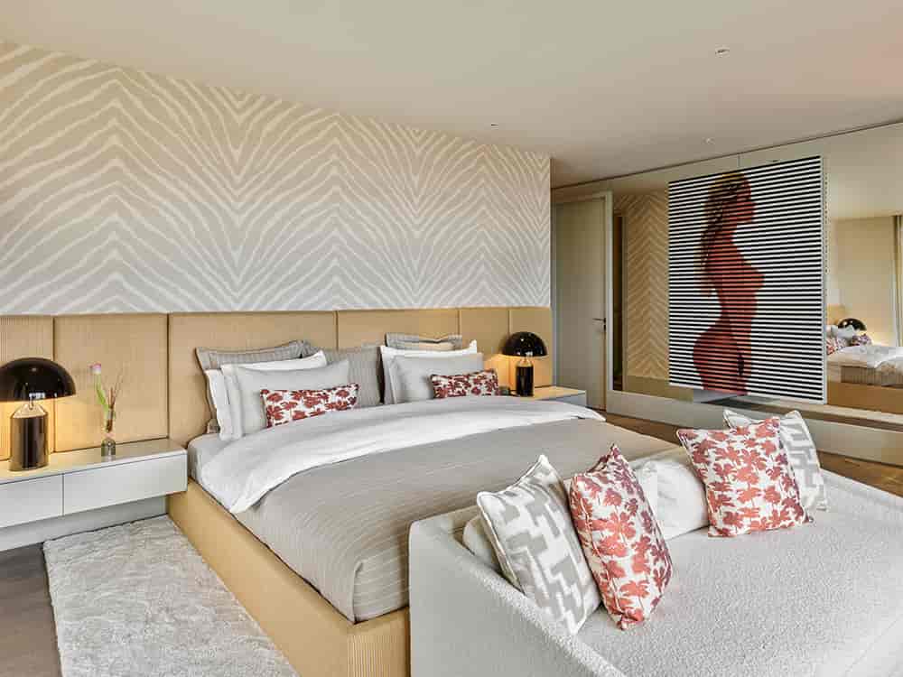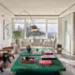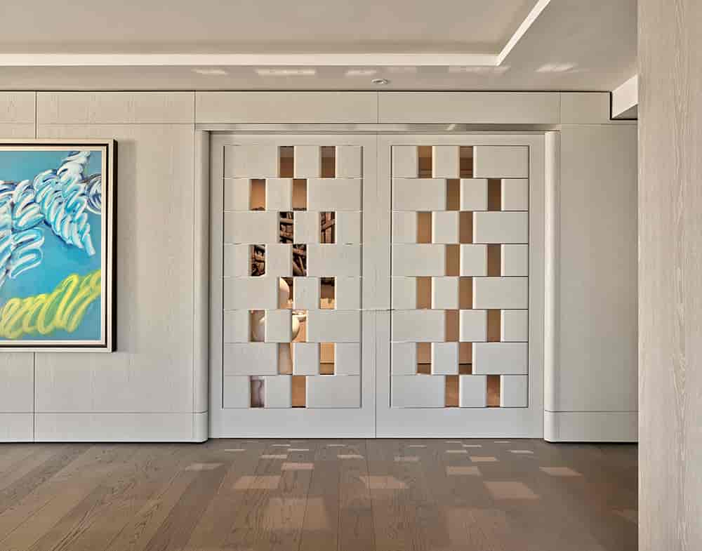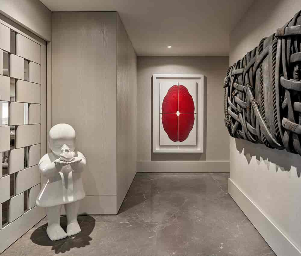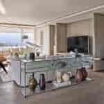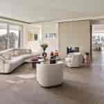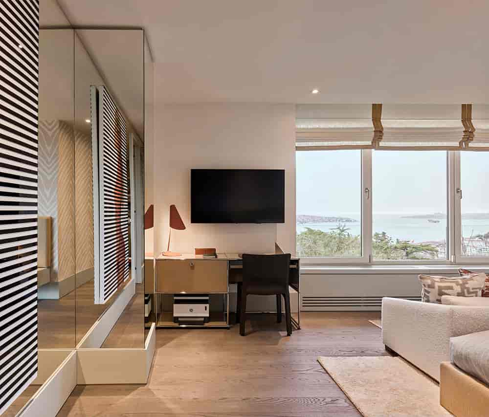Beyaz renk tonlarının hakimiyetindeki yaşam alanında, salonun duvarlarını kaplayan bej ahşap paneller escapefromsofa tarafından tasarlandı. Salonun yemek odası kanadında escapefromsofa imzalı yemek masasına Cassina sandalyeler eşlik ederken bu alan Moooi marka sarkıt aydınlatmalar ile tamamlandı. Bu kanadın şömine etrafındaki oturma alanında, Mozaik’ten alınan B&B Italia kanepe ve koltuklar, Atelier 1976 imzalı sehpalar ile birlikte kullanıldı. Salonun oturma alanı kanadındaki TV ünitesi, escapefromsofa tarafından projeye özel olarak tasarlandı. Cassina marka camel tonu koltuklar, Maxalto marka beyaz kanepeler ve Rezzan Benardete Interiors imzalı orta sehpa ile birlikte kullanılırken, bu kompozisyona kanepenin arkasında yer alan USM marka cam dresuar eşlik etti. Bu kanadın şömine etrafındaki oturma alanında ise Cassina koltuklar, Mozaik’ten alınan Noguchi Coffee Table ile birlikte kullanıldı. Yatak odalarındaki mobilyalar escapefromsofa tarafından proje için özel olarak tasarlandı. Haluk Akakçe, Ayla Turan, Ömer Uluç ve Seçkin Pirim, yaşam alanında işlerine yer verilen sanatçılar oldu.