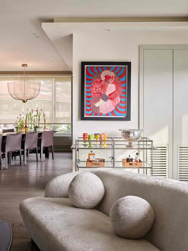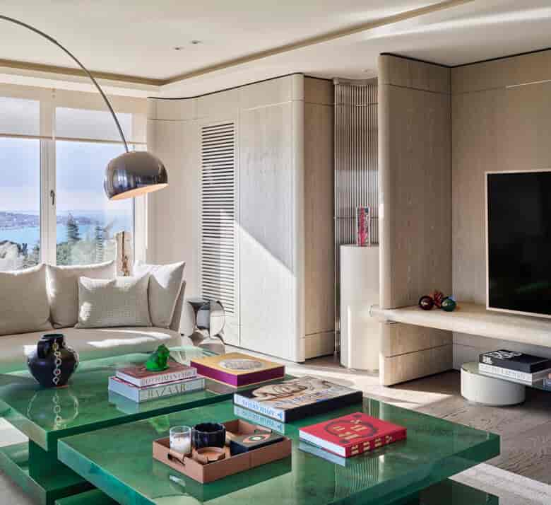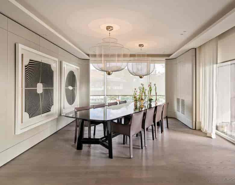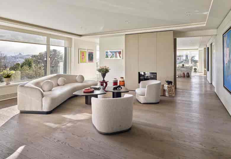 Beyaz renk tonlarının hakimiyetindeki yaşam alanında, salonun duvarlarını kaplayan bej ahşap paneller escapefromsofa tarafından tasarlandı. Salonun yemek odası kanadında escapefromsofa imzalı yemek masasına Cassina sandalyeler eşlik ederken bu alan Moooi marka sarkıt aydınlatmalar ile tamamlandı. Bu kanadın şömine etrafındaki oturma alanında, Mozaik’ten alınan B&B Italia kanepe ve koltuklar, Atelier 1976 imzalı sehpalar ile birlikte kullanıldı. Salonun oturma alanı kanadındaki TV ünitesi, escapefromsofa tarafından projeye özel olarak tasarlandı. Cassina marka camel tonu koltuklar, Maxalto marka beyaz kanepeler ve Rezzan Benardete Interiors imzalı orta sehpa ile birlikte kullanılırken, bu kompozisyona kanepenin arkasında yer alan USM marka cam dresuar eşlik etti. Bu kanadın şömine etrafındaki oturma alanında ise Cassina koltuklar, Mozaik’ten alınan Noguchi Coffee Table ile birlikte kullanıldı. Yatak odalarındaki mobilyalar escapefromsofa tarafından proje için özel olarak tasarlandı. Haluk Akakçe, Ayla Turan, Ömer Uluç ve Seçkin Pirim, yaşam alanında işlerine yer verilen sanatçılar oldu.