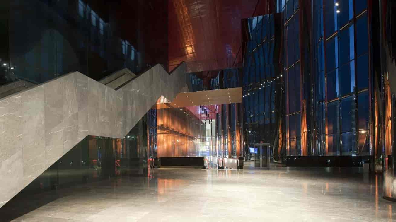 It is split into two arms separated by level differences, in order to overcome the dichotomy between the private and the public. The Piazza surrounded by the retail units creates an alternative public space. The activity stairs direct the public down to the interior mall that also has another direct entrance on the south. The retail level below has asubway connection and includes the cinemas, a gourmet marketand leisure platforms.