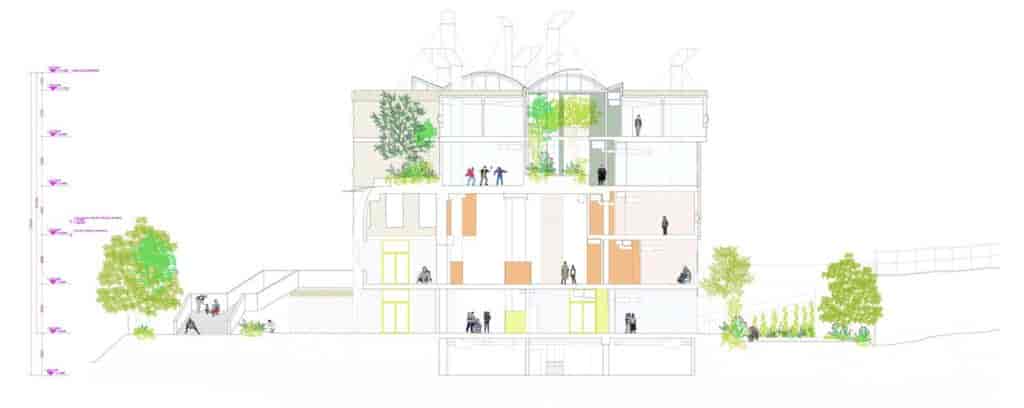 Dikey tasarım prensibinde katların kullanım dağılımı, öğrencilerin okul ekosistemini kendi başlarına ve akranlarıyla birlikte keşfetme kapasitelerinin artmasını sağlayan ve sürekli devam eden bir olgunluk süreci üzerine kurgulanmış. Okulun zemin katında, daha genç öğrenciler için dış mekan ile bağlantılı sınıflar bulunuyor. Üst katlarda, ara sınıflardaki öğrencilerin bir sera yapısı altında eğitim gördüğü yerler bulunuyor.