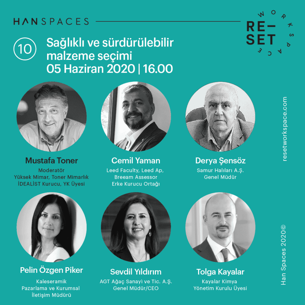 Yeni dönemde çalışma alanlarının standartlarını belirleyecek RE-SET Workspace onuncu canlı yayını ‘Sağlıklı ve sürdürülebilir malzeme seçimi.’ Toner Mimarlık kurucusu ve İDEALİST İç Mimarlık Derneği Kurucu, YK üyesi Mustafa Toner moderatörlüğünde gerçekleşti. Yayının konuşmacıları, Erke kurucu ortağı Leed Faculty, Leed Ap. Breeam Assessor Cemil Yaman, Samur Halıları A.Ş. Genel Müdürü Derya Şensöz, Çanakkale Seramik Pazarlama ve Kurumsal İletişim Müdürü Pelin Özgen Piker, AGT Genel Müdür CEO Sevdil Yıldırım, Kayalar Kimya YK Üyesi Tolga Kayalar.
