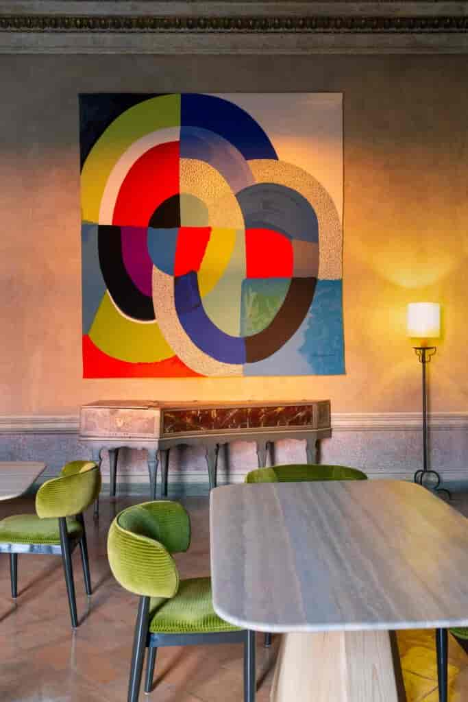 Tercihler genel anlamda modern Fransız ve İtalyan mobilyalarından yana kullanıldı. Petit Salon’da Milano merkezli tasarımcı Toan Nguyen’in duvarların rengiyle uyumlu turuncu dev modüler kanepesi yer alırken Salon des Pensionnaires’de Fransız tasarımcı Noé Duchaufour-Lawrance’ın masası dikkat çekiyor. Odanın karamsar havasını bir nebze kırmak için de İtalyan tasarımcı Chiara Andreatti imzalı gri-mavi kanepe ve koltuklar sahneye çıkıyor. Fendi ve Mobilier National, birçok mekanda Louise Bourgeois, Sheila Hicks ve Sonia Delaunay gibi tanınmış sanatçıların duvar halılarına yer verdi. Villa’nın iç mekanlarındaki ses kalitesini belirgin oranda artıran Devialet imzalı akustik paneller de sanat eserlerinin arkasına yerleştirildi.
