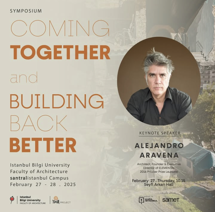 İstanbul Bilgi Üniversitesi Mimarlık Fakültesi ve Yuva Project iş birliği, Aura İstanbul’un desteğiyle düzenlenen uluslararası “Coming Together and Building Back Better” Sempozyumu, 27-28 Şubat 2025 tarihlerinde Santralistanbul Kampüsü’nde gerçekleşecek. Açılış konuşmasını Pritzker Ödüllü mimar Alejandro Aravena’nın yapacağı etkinlik, sürdürülebilir kentsel dönüşüm, topluluk odaklı tasarım ve afet sonrası toparlanma gibi güncel konuları ele alacak.