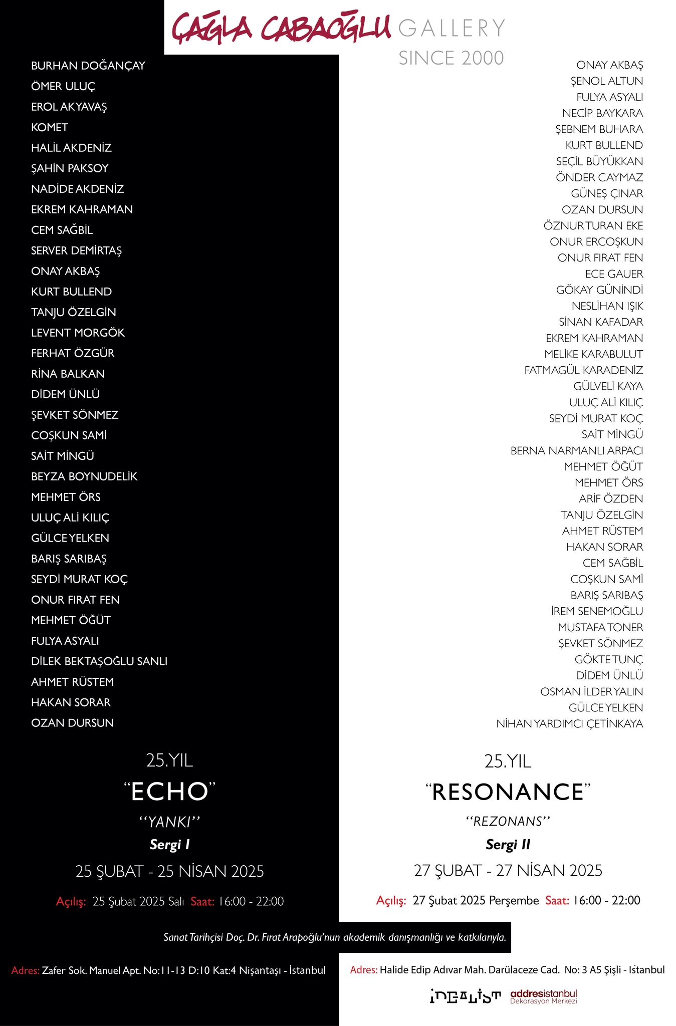 Çağla Cabaoğlu Galeri, 25. yılını “Yankı / Echo” ve “Rezonans / Resonance” sergileriyle kutluyor. “Yankı”, 25 Şubat’tan 25 Nisan’a kadar galerinin ana mekânında ziyaretçilerle buluşurken, “Rezonans” sergisi 27 Şubat – 27 Nisan tarihleri arasında İDEALİST İç Mimarlık Derneği merkezinde sanatseverlere sunuluyor. Bu özel sergilerle galeri, Türkiye çağdaş sanatının farklı kuşaklarını bir araya getirerek sanatsal üretimin geçmiş ve gelecek arasındaki etkileşimini görünür kılmayı hedefliyor.