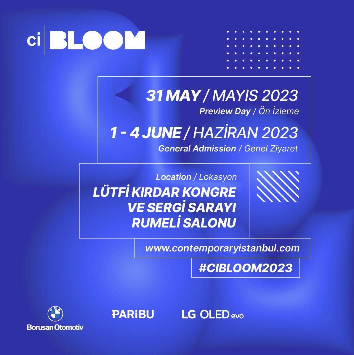 Contemporary İstanbul tarafından organize edilen Türkiye’de çağdaş sanatın büyümesine odaklanan sanat fuarı CI Bloom’un ikinci edisyonu 1- 4 Haziran tarihleri arasında Lütfi Kırdar Kongre ve Sergi Sarayı Rumeli Salonları’nda sanatseverlerle buluşuyor. Borusan Otomotiv BMW Türkiye, Paribu ve LG OLED evo partnerliğinde ve Türk Hava Yolları’nın iş birliğinde düzenlenen CI Bloom’da, 25 çağdaş sanat galerisinden 286 sanatçı ve 572 eser yer alıyor. CI Bloom, bölgenin yeni nesil sanatçılarını ve sanat profesyonellerini bir araya getirerek ve birlikte özel projelere ve inisiyatif katılımlarına imkan sunarak Türkiye’nin sanat sektörünün gelişmesini ve çeşitlenmesini teşvik ediyor. Fuar programında özel projelerin yanı sıra mimarlık, çağdaş ve dijital sanat ağırlıklı konferanslar da yer alıyor.