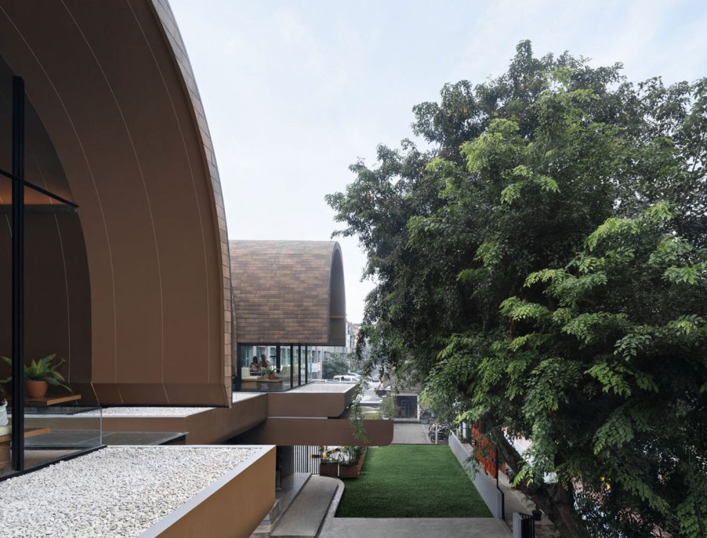 Oturma alanları, bahçe ve su manzarasının kesintisiz algılanmasını sağlayacak biçimde yapı kurgusunun üzerine yükseltilmiştir. Çatı, hem tünel hem de gölgelik görevi görerek, dinamik doğal havalandırma seçenekleri sunarken, çevredeki doğanın mimari deneyimin merkezinde kalmasını sağlar. Bu sayede yapı, iklimsel ve duyusal anlamda kullanıcıyı saran bir atmosfer üretir.