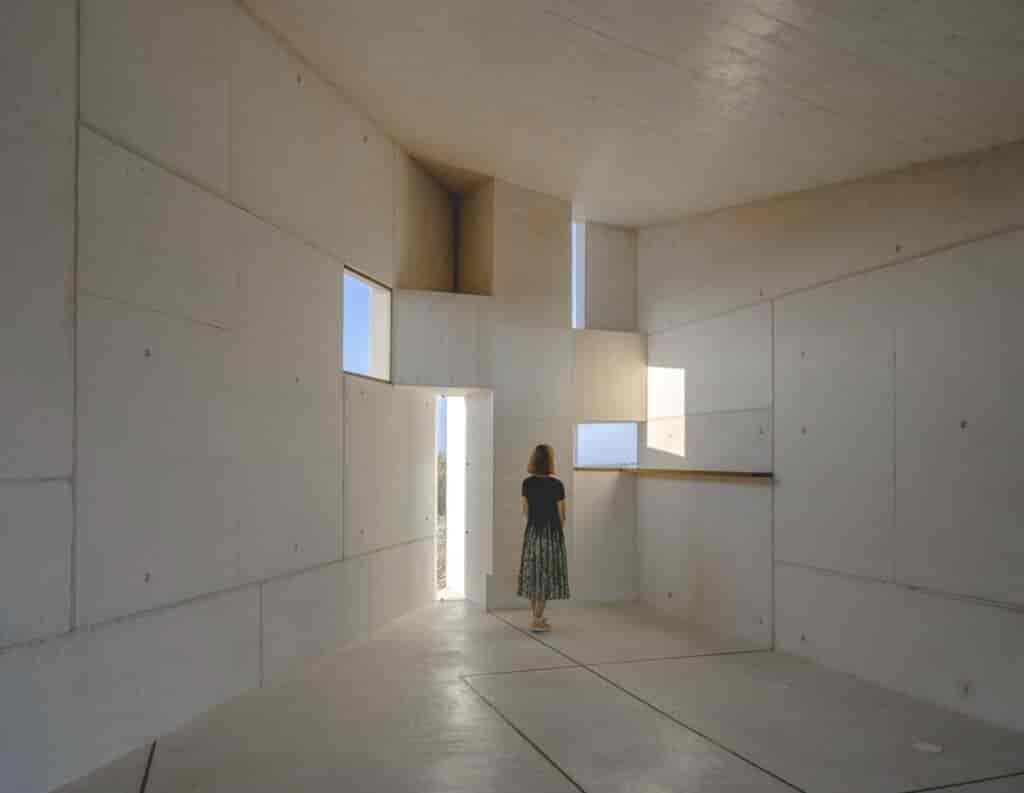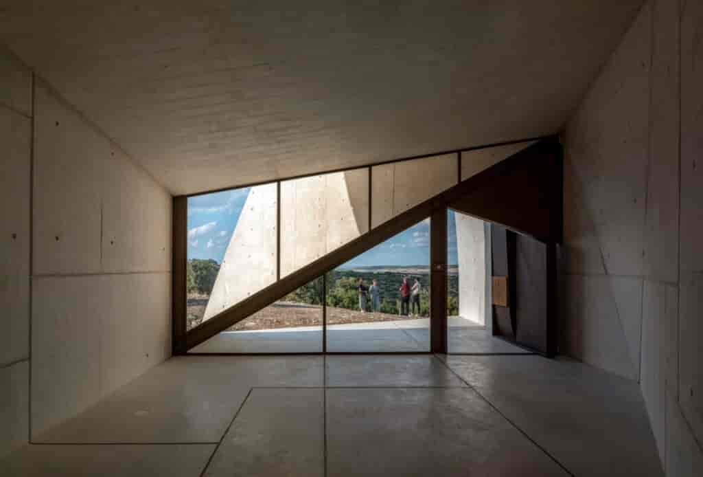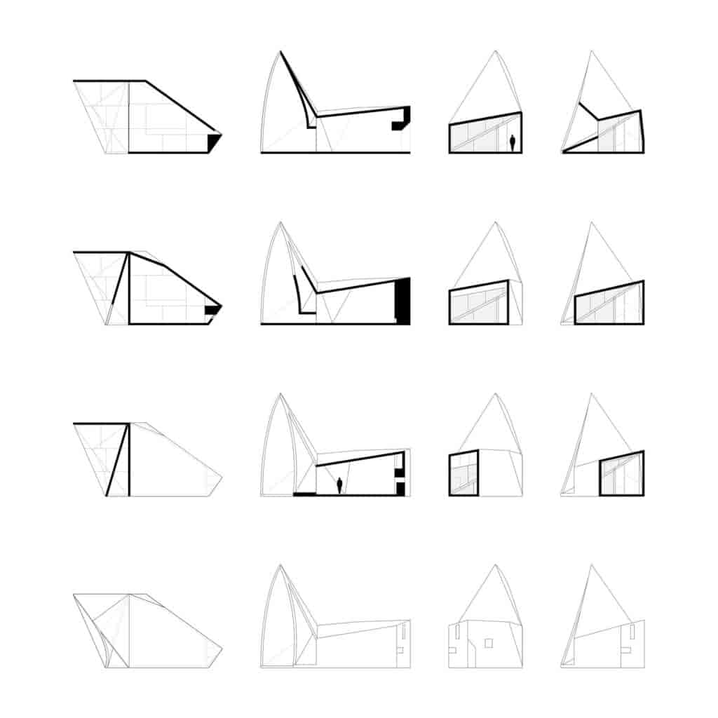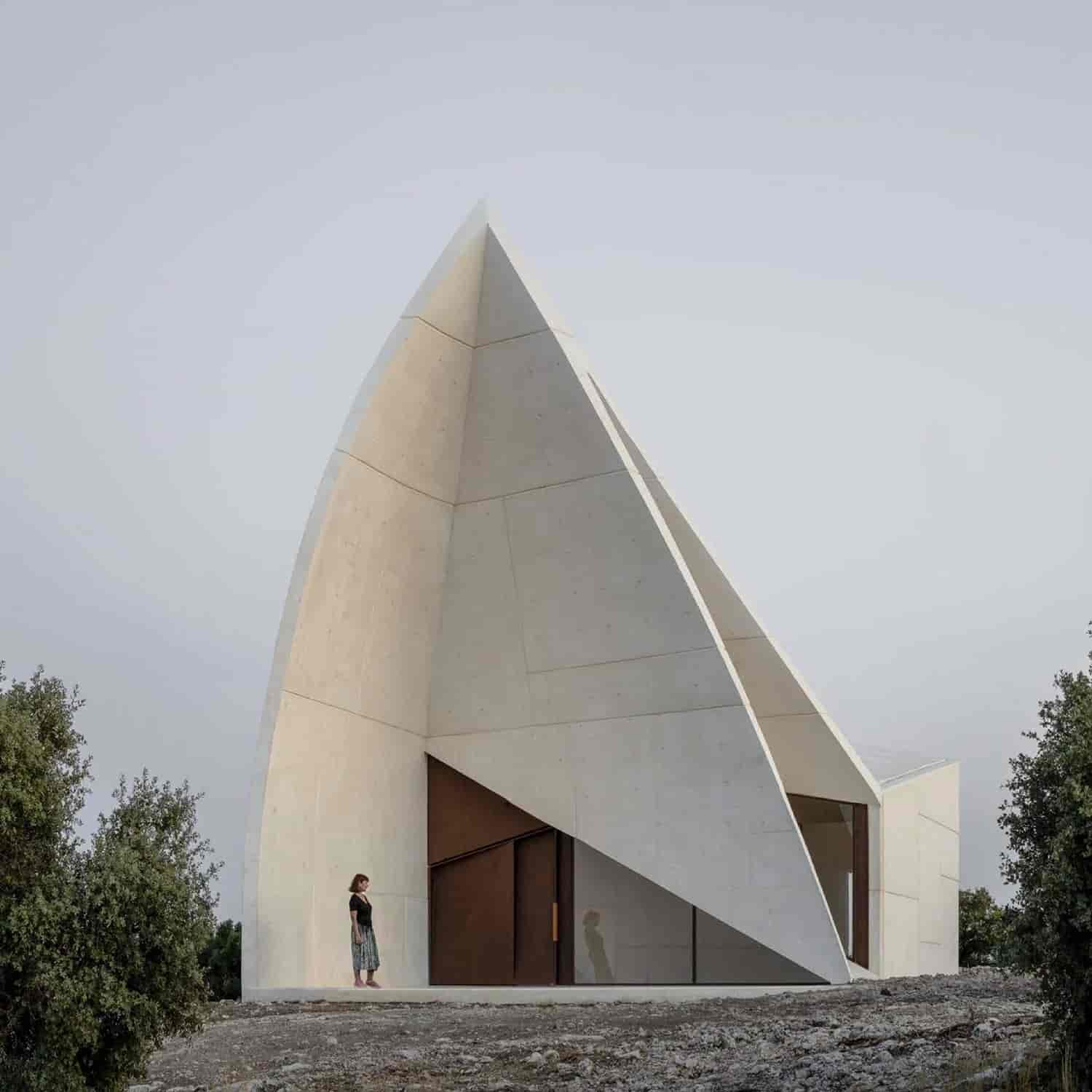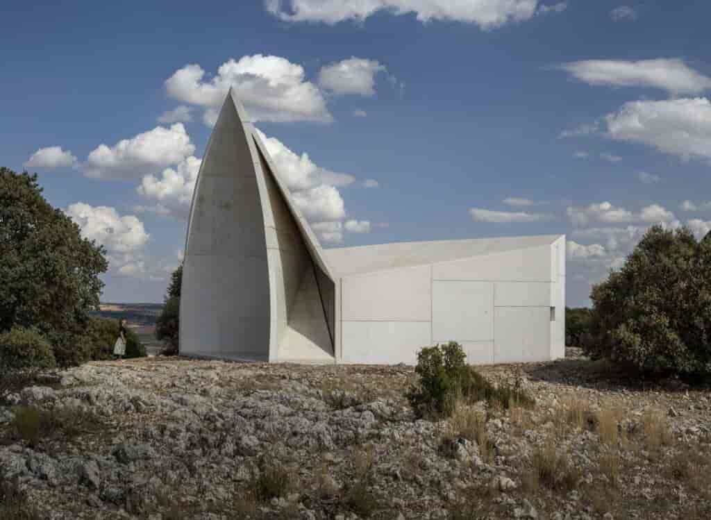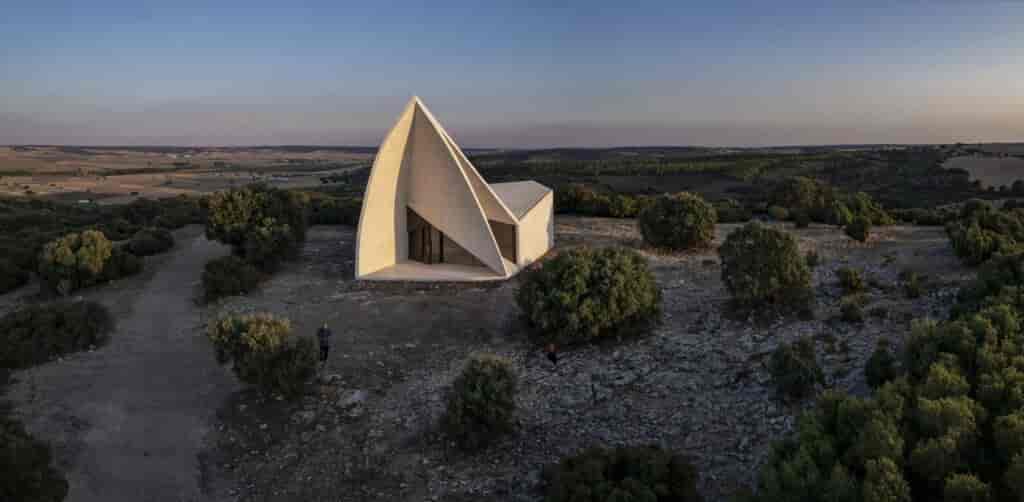 Madrid merkezli mimarlık ofisi Sancho Madridejos, İspanya’nın dağlık kırsal arazisi Cuenca’da formunun origamik şekilleri andırdığı minimalist bir şapel tasarladı. Küçük bir tepenin zirvesinde konumlanan ve ev sahiplerinin özel isteği üzerine tasarlanan şapel, sadeliği ve keskin geometrik formu ile ön plana çıkıyor. Proje, iç mekanda beton malzeme ve doğal ışık kullanımı yönünden Tadao Ando’nun Church of Light’ına atıfta bulunuyor.