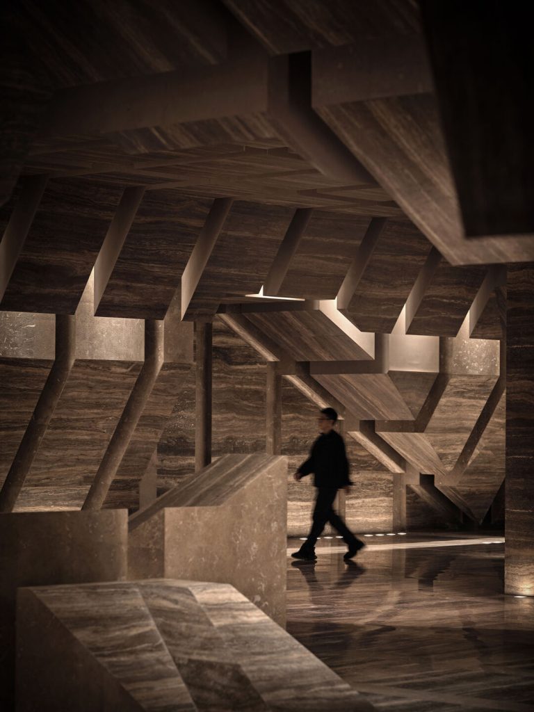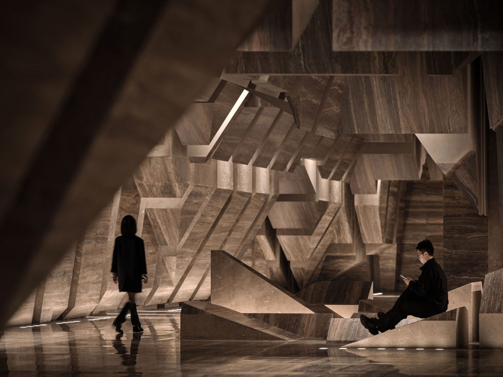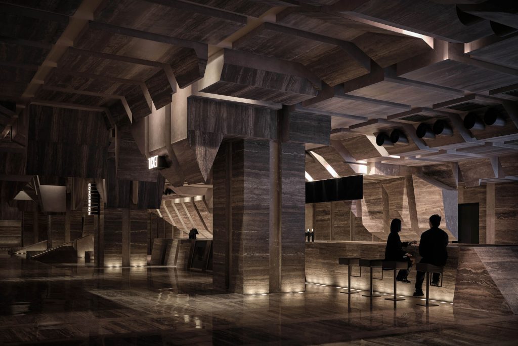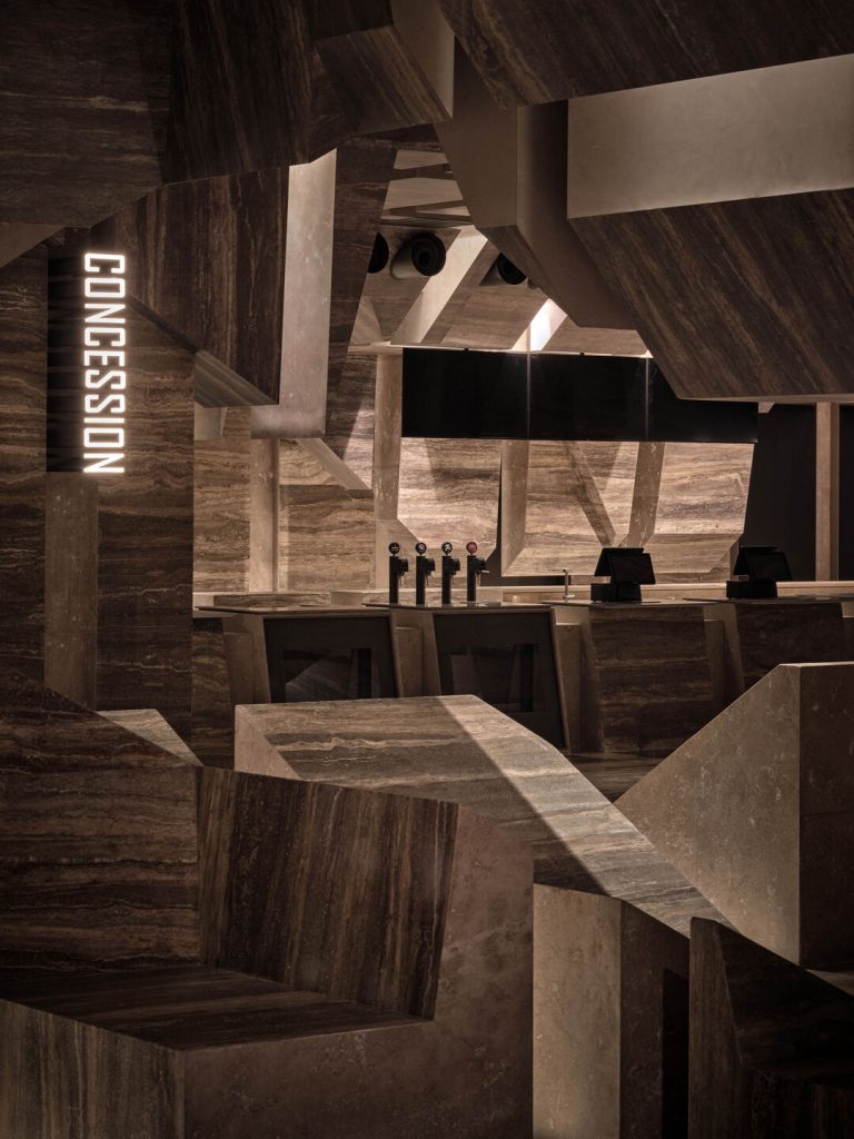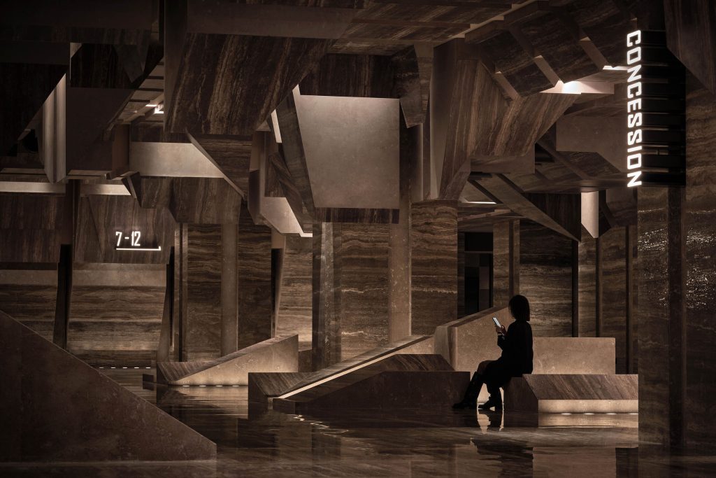 Wushang Dream Mall Uluslararası Sineması’nın genel atmosferi oldukça loş ve samimi bir havaya sahip. One Plus Partnership ekibi, aydınlatma sistemlerini ustaca gizleyerek ve sadece ‘kutular’ arasındaki boşlukları aydınlatarak mekanın dikkat çekici bir şekilde aydınlatılmasını sağlıyor. Malzeme seçimi konusunda, farklı renkler ve dokulara sahip taşlar tercih edilmiş ve doğal taş desenleri, metal panellere, kumaşlara, halılara ve diğer malzemelere işlenerek mekanda benzersiz bir görsel etki yaratılmış. Binanın yükünü ve maliyet kontrolünü düşünerek, ekip tavandaki taş desenlerini metal malzemeye aktarmış ve böylece hem tavanın yükünü azaltmayı hem de daha güvenli ve ekonomik bir yapı ortaya çıkarmayı hedeflemiş. Farklı malzemelerde gerçekçi bir taş deseni etkisi yaratmak için mimarlar, gerçek ve yapay taş arasındaki farkı anlamamızı imkansız kılacak şekilde neredeyse bir yıl boyunca hazırlık çalışması yapmışlar.