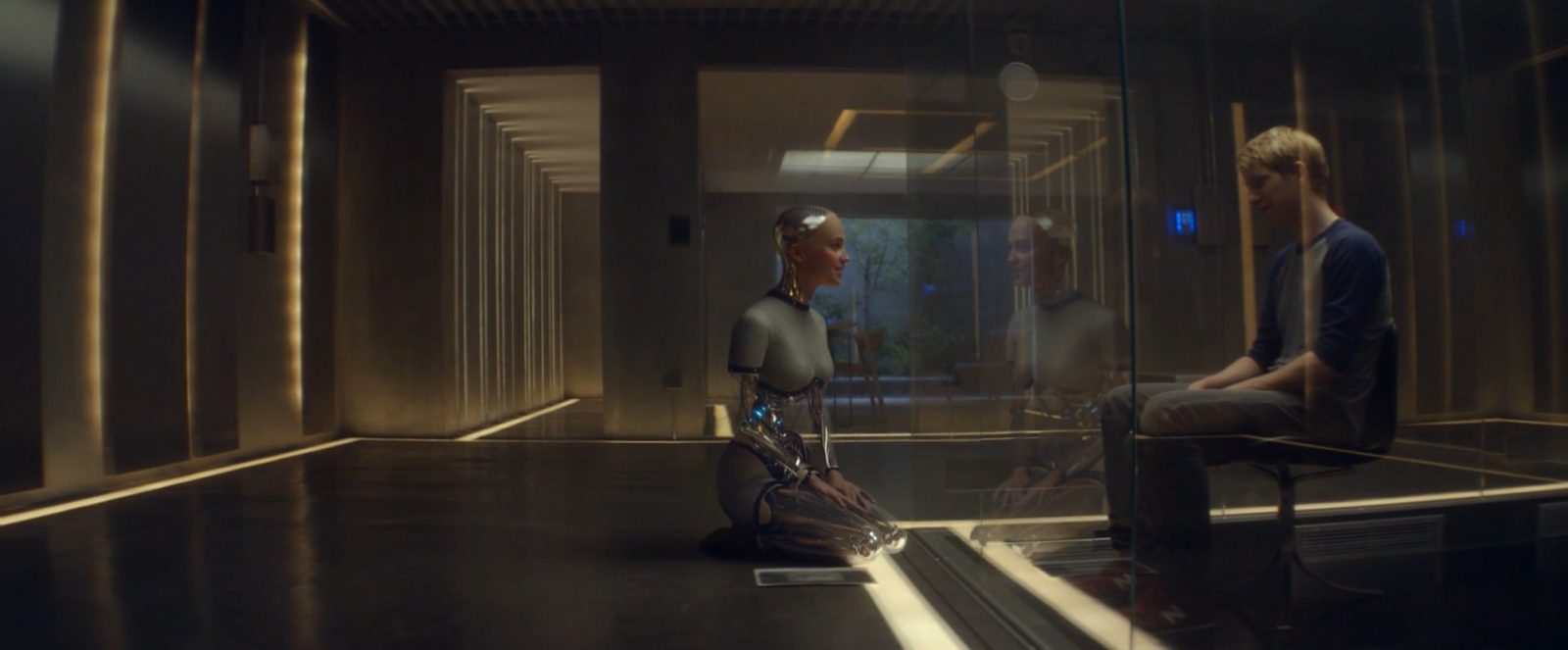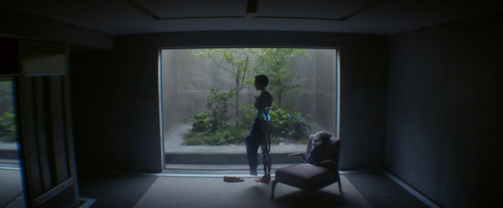 Bu eşitsizliği, Ava’nın alt kattaki giyinme odasında, camın arkasında görünen ağaçla hissederiz. Ava, bu ağacı net bir biçimde görebilir ancak cam, aradaki keskin sınırı çizer. Ava’nın “insan” gözükmek için attığı ilk adımda, doğal ve gerçek olana duyduğu yakınlık ile ona erişiminin olmaması arasındaki çelişki açığa çıkar. Cam, Ava’nın tam anlamıyla insan olamayacağını; doğal olanla arasındaki sınırın hep var olacağını hissettirir.