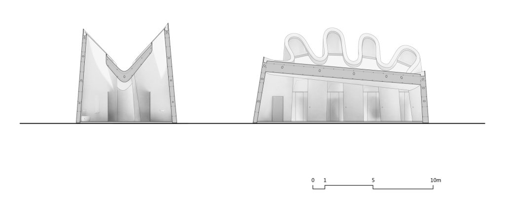 Binanın ortasındaki sirkülasyon alanı daha alçak bir tavana sahipken, her iki taraftaki kabin alanları daha fazla ışığa izin vermek için daha yüksek bir hacme sahip. Her iki uçtaki girişler de orta alandan daha yüksektir. İç mekandaki aydınlatma, iç mekanın eğrisel şekline bağlı olarak değişmekte ve kaymaktadır.