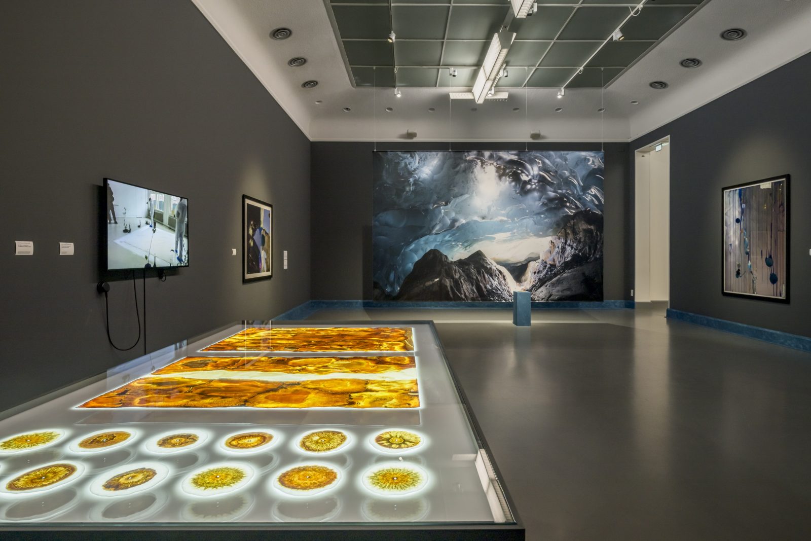 Fotoğrafta arkada görünen eserde ise sanatçı Diewke van der Heuvel, Melting Heart adlı serisinde Avrupa Alpleri’nin en büyük buzulu olan Aletsch’in eriyiş anından bir kare yakalıyor. Geri dönüştürülmüş kumaş üzerine basılan büyük ölçekli fotoğraf, doğal çevrenin görkemini ve iklim değişikliğinin yol açtığı etkileri kaydediyor.